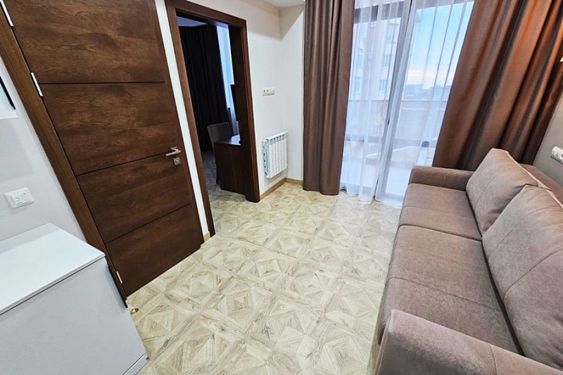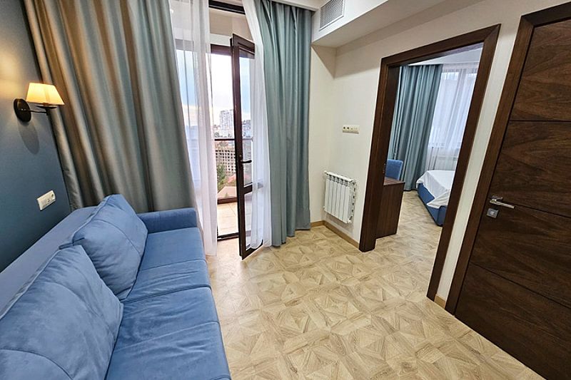 Двухкомнатный номер с балконом площадью 30-40 кв.м с одной двуспальной кроватью 160*200 см и двуспальным диваном.