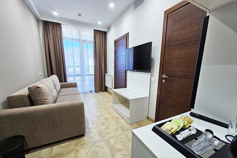 Комфортный двухкомнатный номер с балконом площадью 40-45 кв.м с одной двуспальной кроватью 180*200 см и двуспальным диваном.