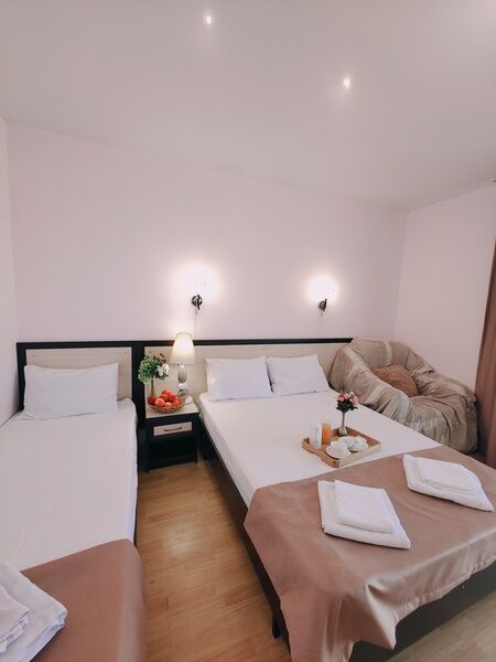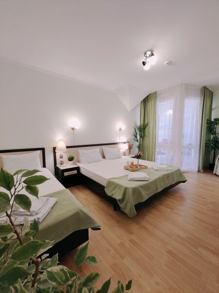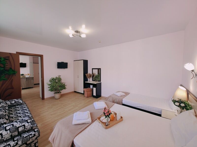 В одной комнате номера стоит 2-х спальная кровать и односпальная кровать, а во втором 2-х спальный диван и кресло-кровать.