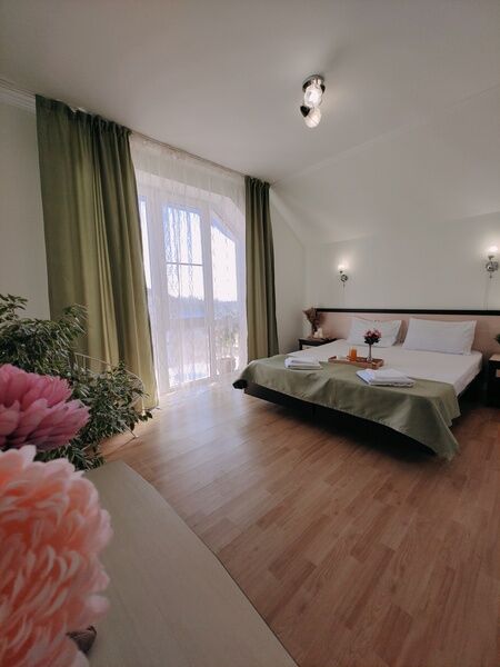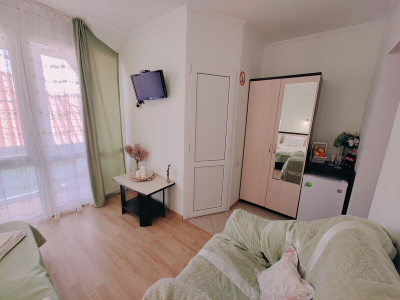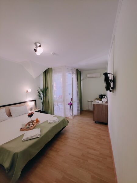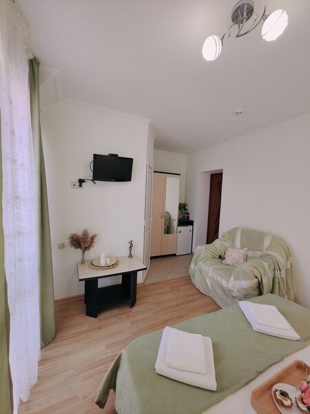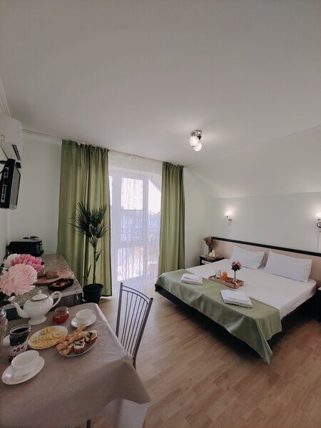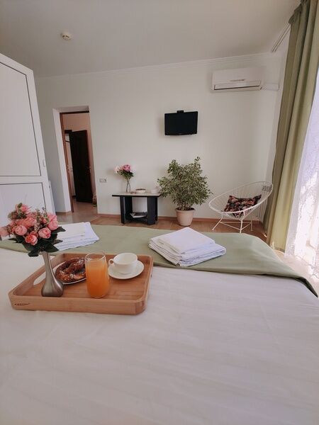 В распоряжении отдыхающих номера для семейных пар и некурящих людей, оснащенные телевизором с плоским экраном, кондиционером, собственной ванной комнатой, террасой. В номере есть прикроватные тумбочки, стол, стулья. На территории работают столовая и буфет, есть детская площадка и подземная парковка. Хозяева гостевого дома постарались обустроить территорию так, чтобы каждый турист чувствовал себя как дома.