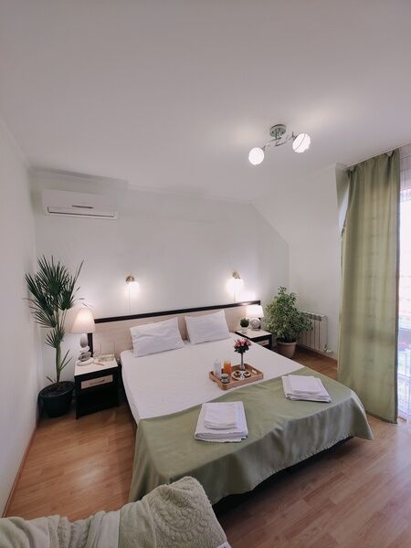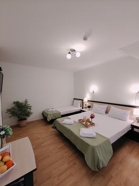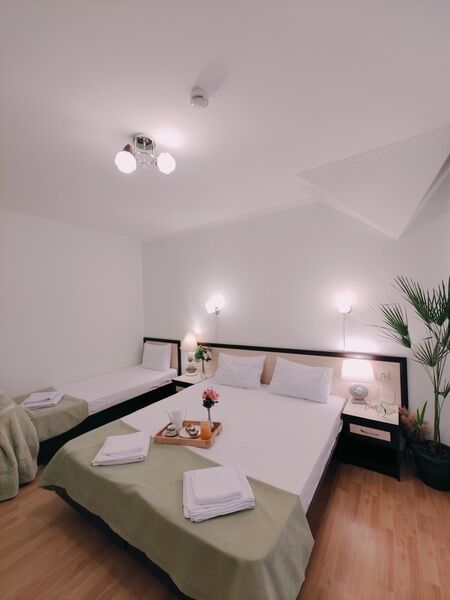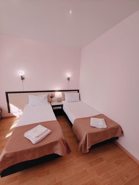 - Здание 4 этажа (без лифта), с разным номерным фондом. Есть большие двухкомнатные номера на 5-х человек. Мы взяли двухкомнатный номер. Номер нам понравился, он довольно уютный. В номере чисто и комфортно. Есть один минус, матрасы на кроватях пружинные, не очень комфортно спать.