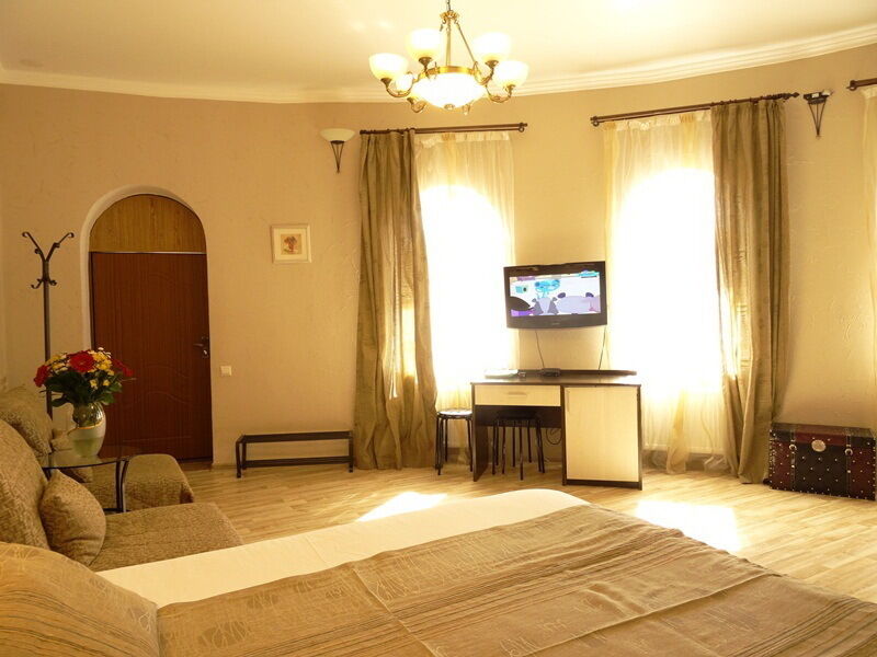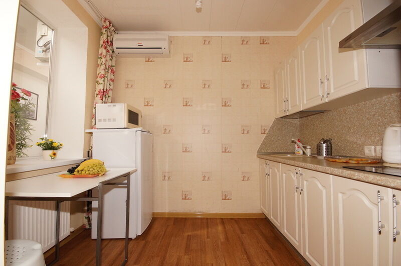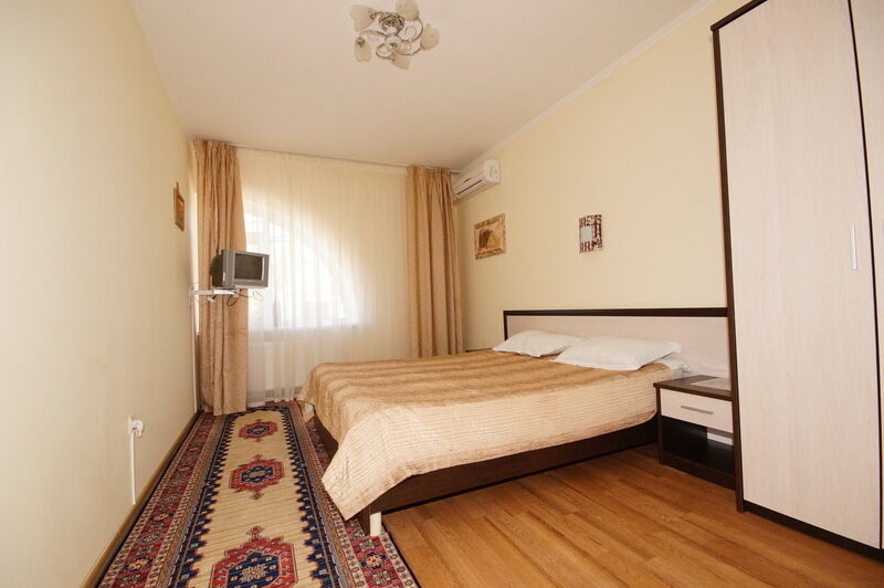 2-х комнатный номер «Апартаменты» с кухней - двухкомнатный четырех местный номер (4 основных места) с возможностью размещения 1 человека на дополнительном месте (раскладная кровать). Площадь номера - 42 кв.м. Номер состоит из двух изолированных комнат (гостиная и спальная комната), кухни, прихожей и с/узла. В спальной комнате: 2-х спальная кровать, платяной шкаф, тумбочки, туалетный столик и телевизор ЖК. Гостиная: диван (раскладной), туалетный столик, телевизор ЖК. Кухня оборудована кухонной мебелью, посудой, электроплитой, элек. чайником, микроволновкой, холодильником. Номер оборудован ванной комнатой с душевой кабиной. В ванной комнате имеется стиральная машинка – автомат. В номере имеется: две сплит-системы, сейф, фен, гладильная доска и утюг.
