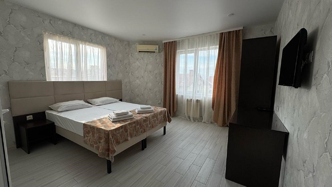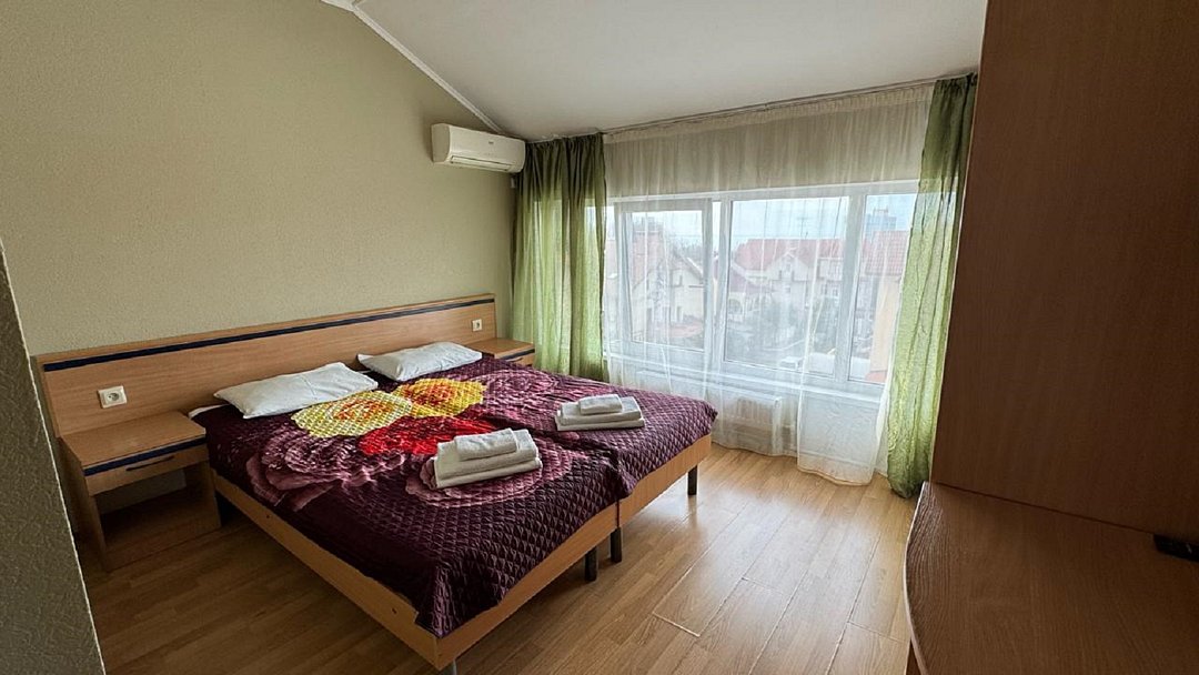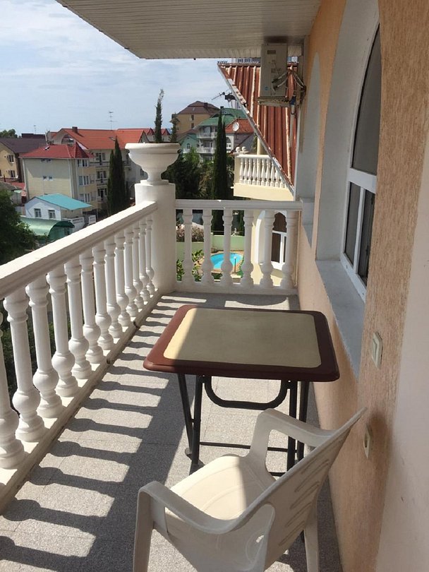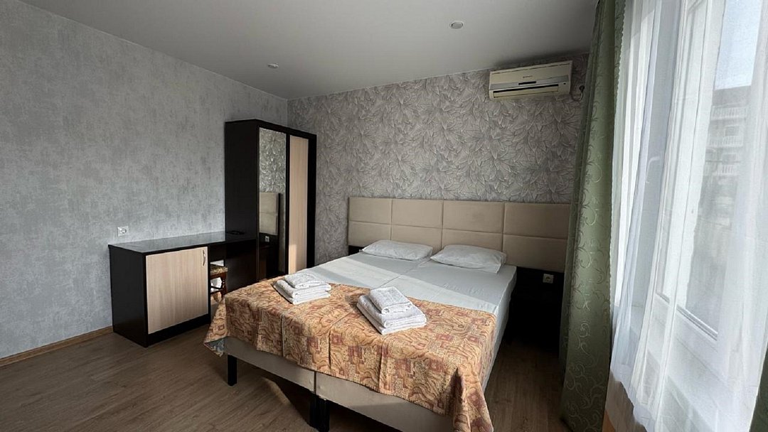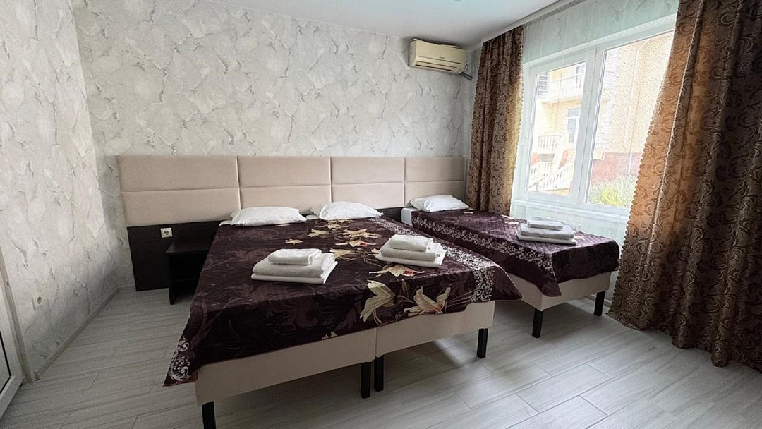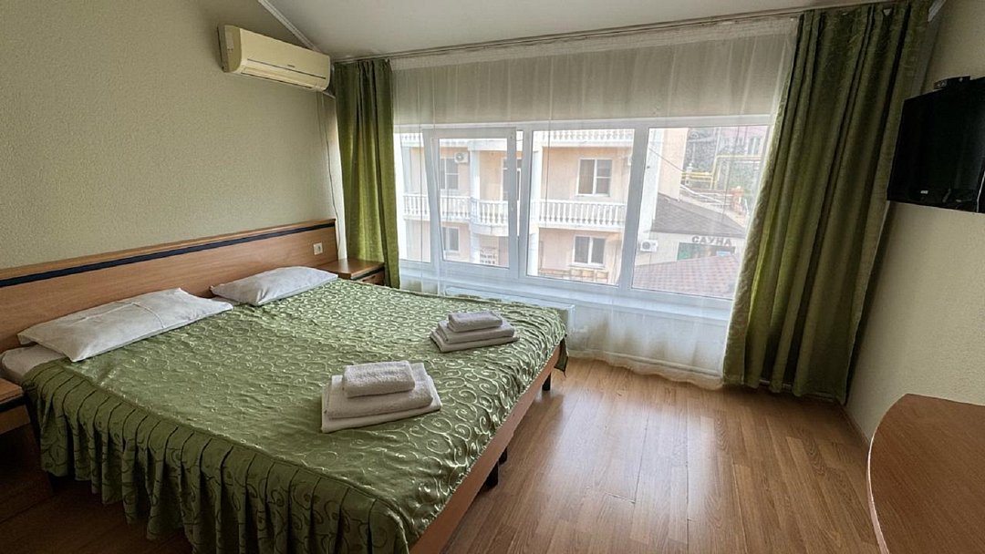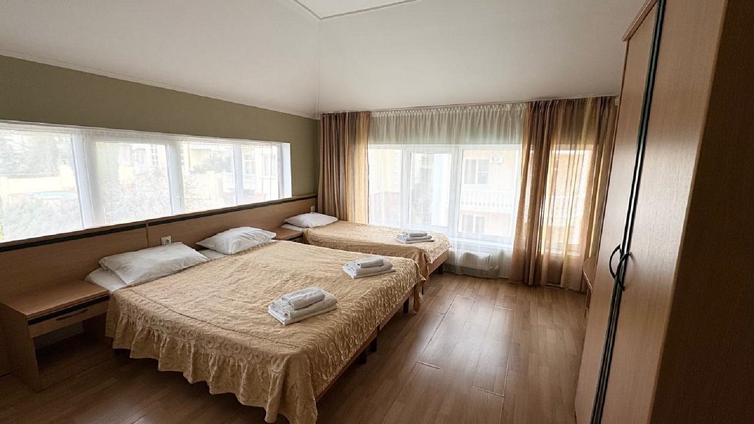 Двуспальная кровать+односпальная или три односпальные кровати, шкаф, тумбочка, стол, телевизор, мини-холодильник, сплит-система, с/у совмещен с душем (бортики), Wi-Fi. Площадь номеров от 18 до 20 кв.м. Общий балкон.