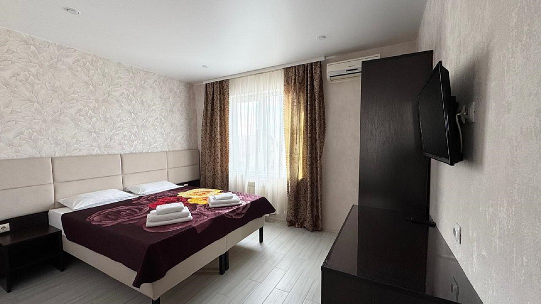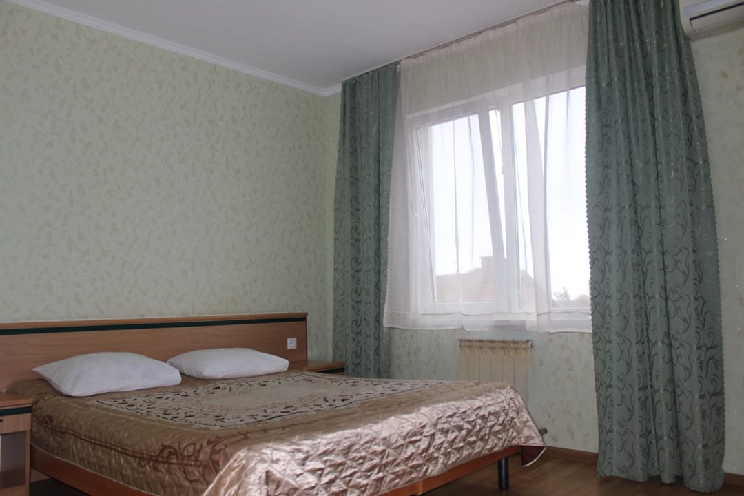 Двуспальная кровать или две односпальные кровати, шкаф, тумбочка, стол, телевизор, мини-холодильник, сплит-система, с/у совмещен с душем (бортики).Wi-Fi. Площадь номеров от 17 до 20 кв.м.