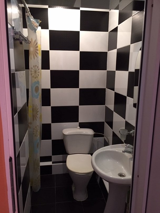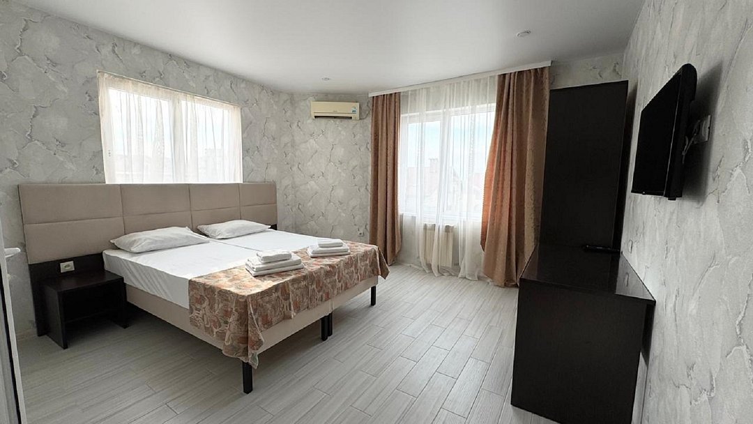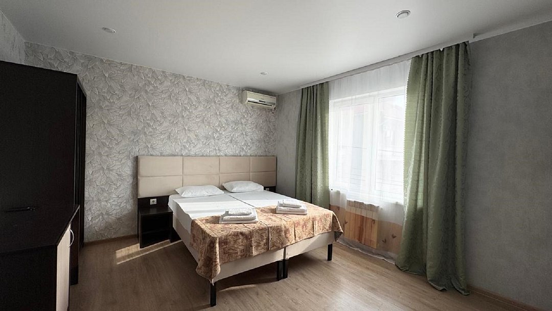 Две двуспальные кровати, шкаф, тумбочка, стол, телевизор, мини-холодильник, сплит-система, с/у, Wi-Fi, совмещен с душем (бортики).