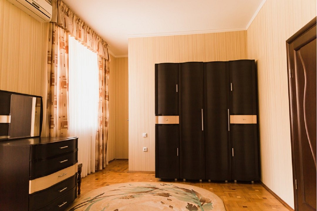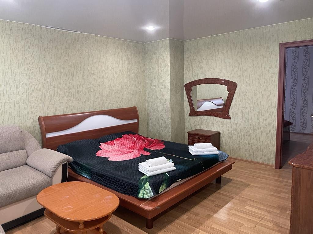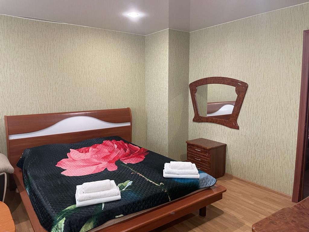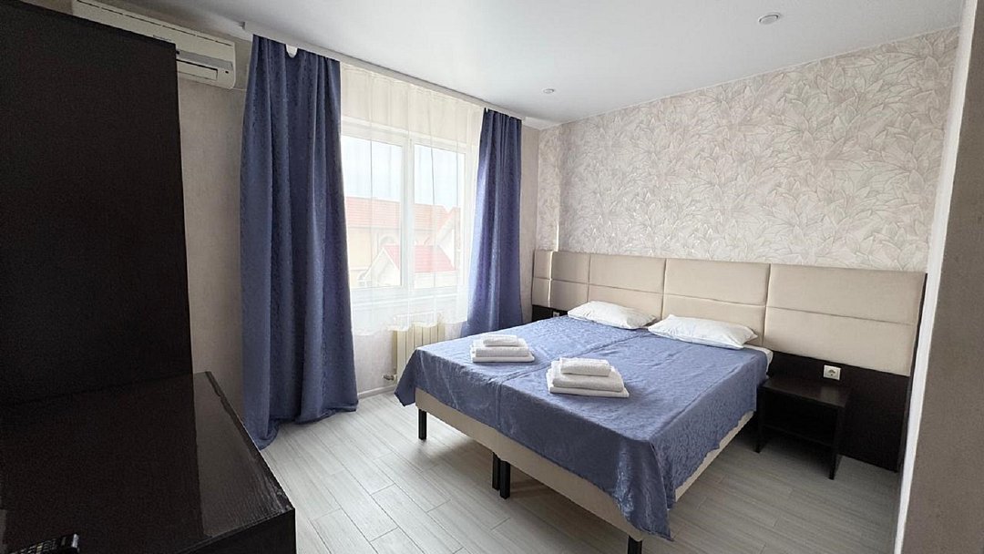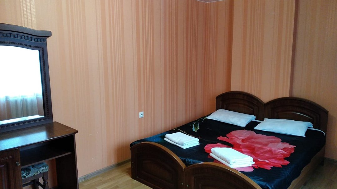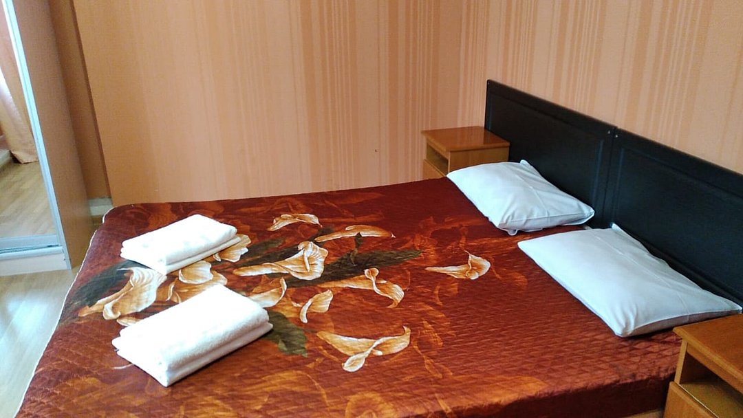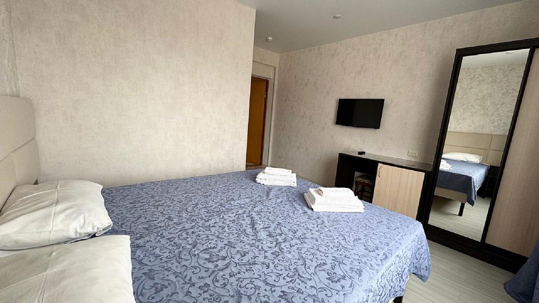 Две комнаты, две двуспальные кровати, шкаф, тумбочка, стол, телевизор, холодильник, сплит-система, с/у совмещен с душем (бортики),Wi-Fi. Общий балкон.