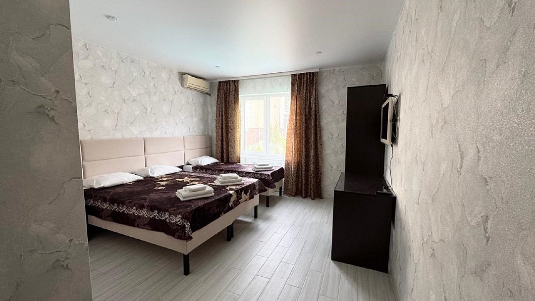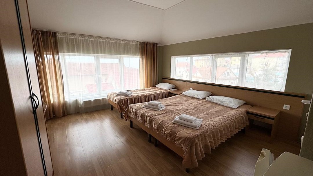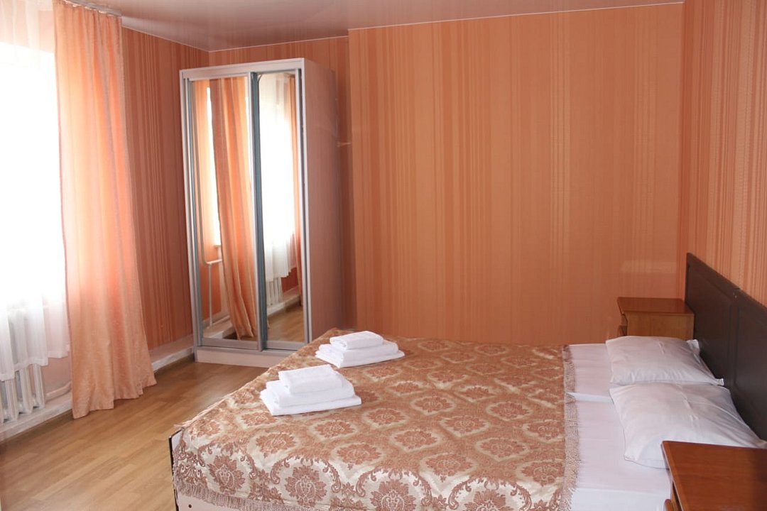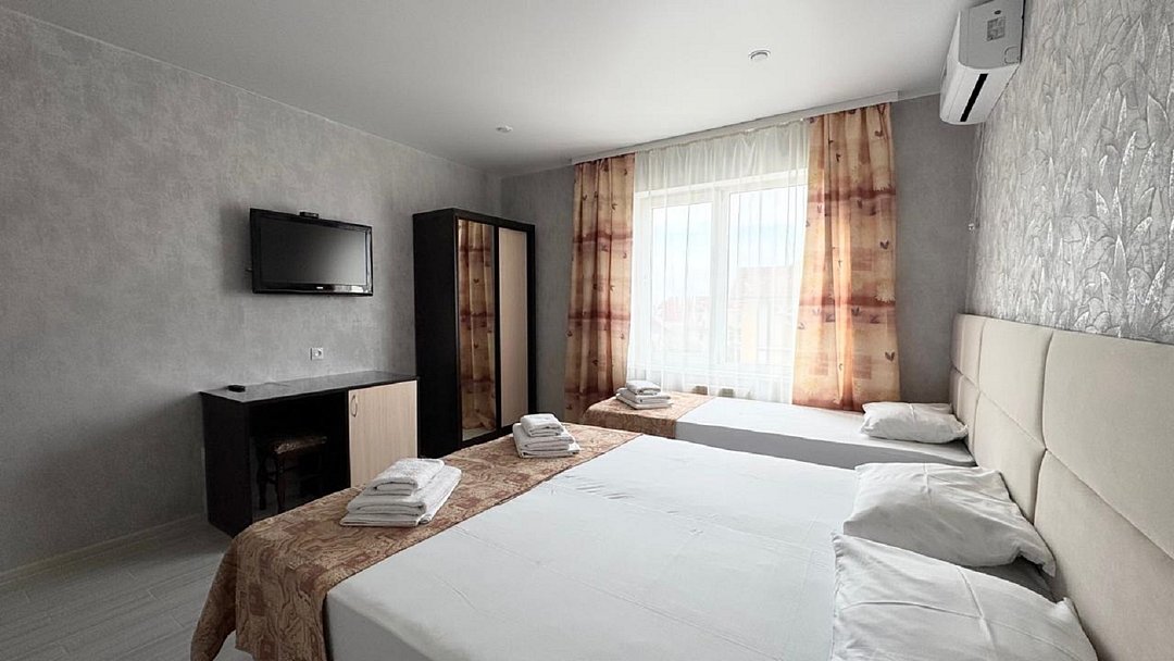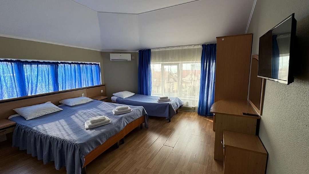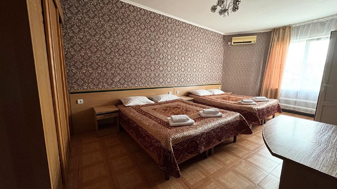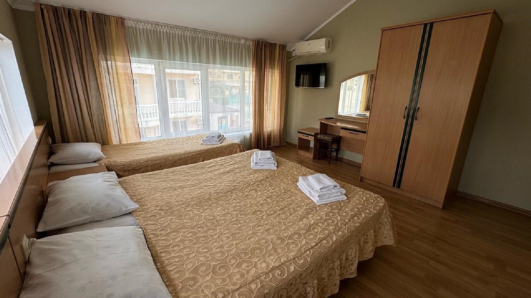 Двуспальная кровать+односпальная или три односпальные кровати, шкаф, тумбочка, стол, телевизор, мини-холодильник, сплит-система, с/у совмещен с душем (бортики),Wi-Fi. Площадь номеров от 17 до 20 кв.м.