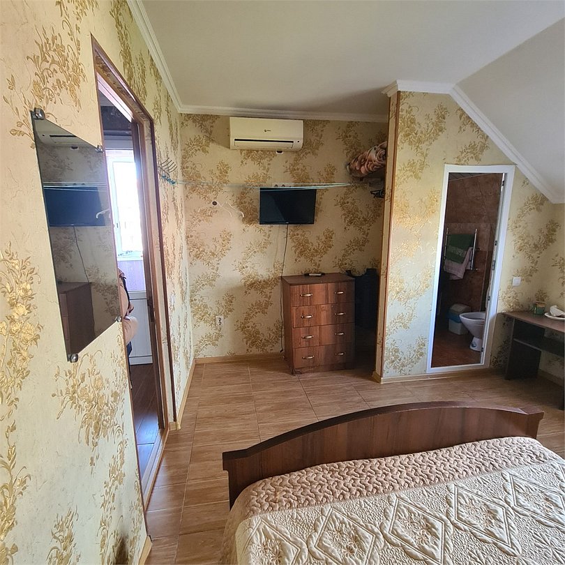 Wi-Fi, холодильник, кондиционер, кровать «King size», шкаф для одежды, вешалки, зеркало, унитаз, душ, тумба, телевизор с плоским экраном, двухъярусная кровать, частный двор, мыло, без питомцевВ гостиничном номере