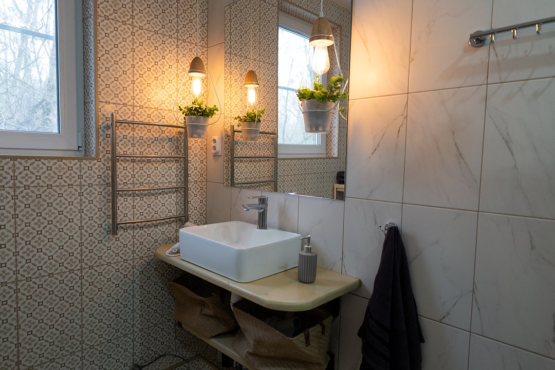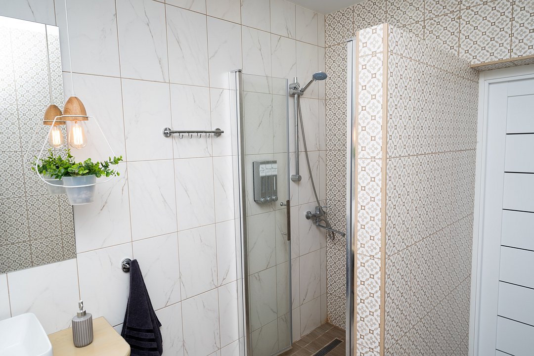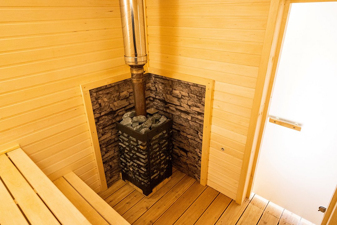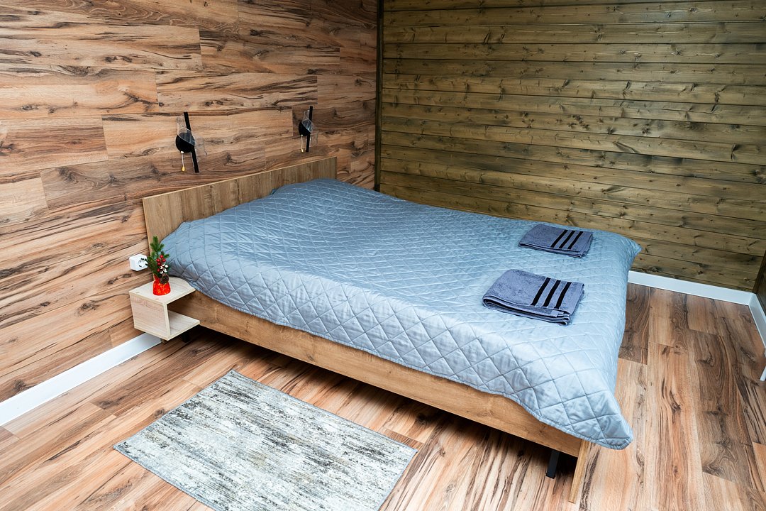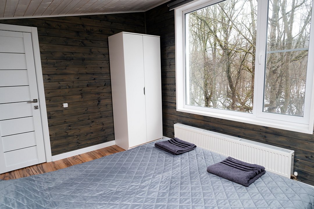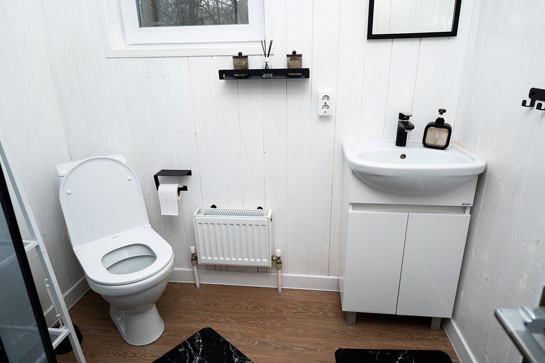 Дом подходит для комфортного отдыха восьми человек (максимально с дополнительным местом десяти человек). В доме два санузла, три изолированные спальни и просторная кухня-гостиная. Кухня оборудована: холодильник, варочная поверхность, СВЧ печь, чайник, посудомоечная машина, посуда, кулер с питьевой водой.