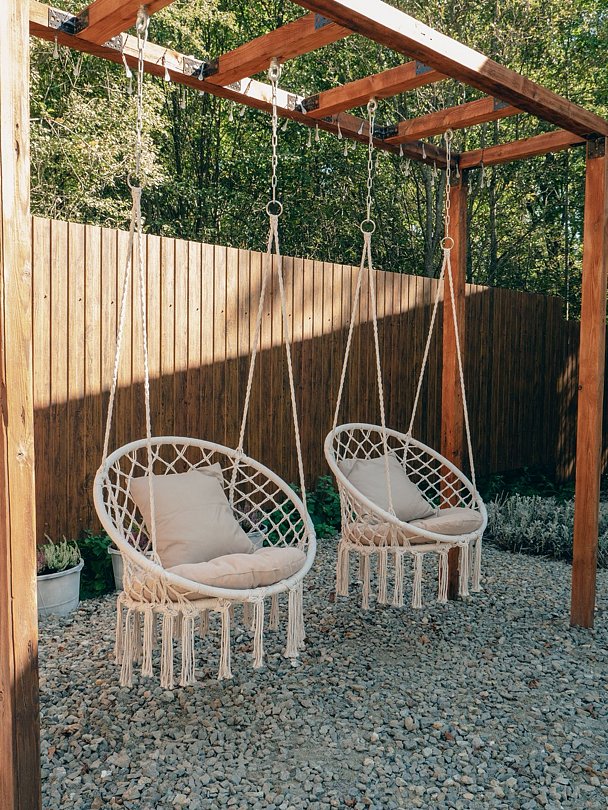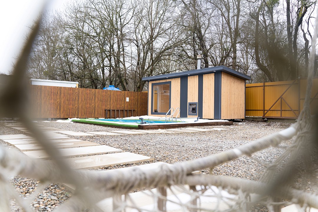 На территории дома гостей ждет просторная терраса с большим столом, мангальная зона с шампурами и решетками, а также подогреваемый бассейн с подсветкой. Для отдыха на свежем воздухе также предусмотрены подвесные качели и уютное кресло-кокон.