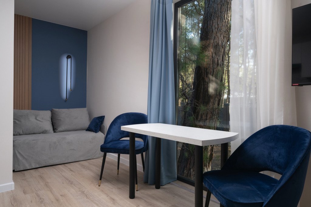 В одной комнате располагается двуспальная кровать. в другой – удобное спальное место для двоих детей или одного взрослого. Номера оборудованы кухонной зоной, современной ванной комнатой и теплым полом. Индивидуальная терраса с видом на море для уединенного отдыха.