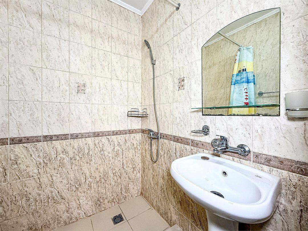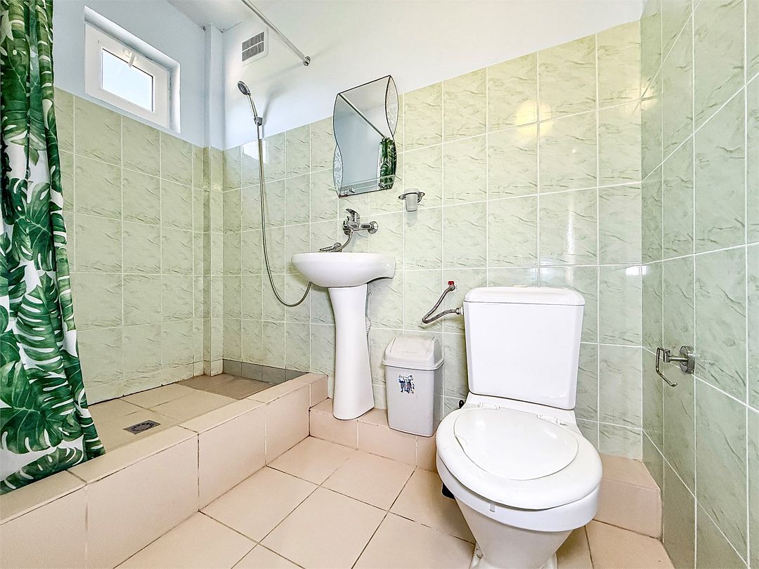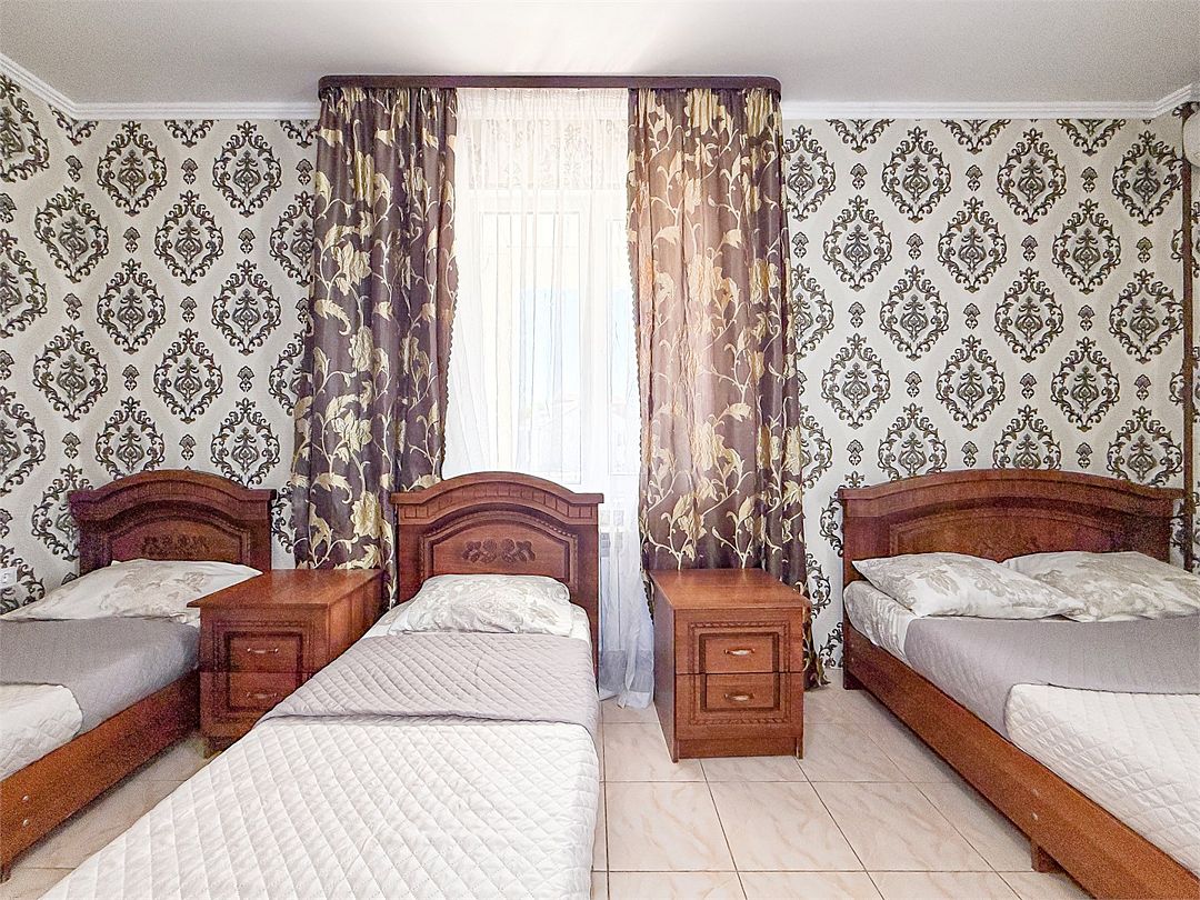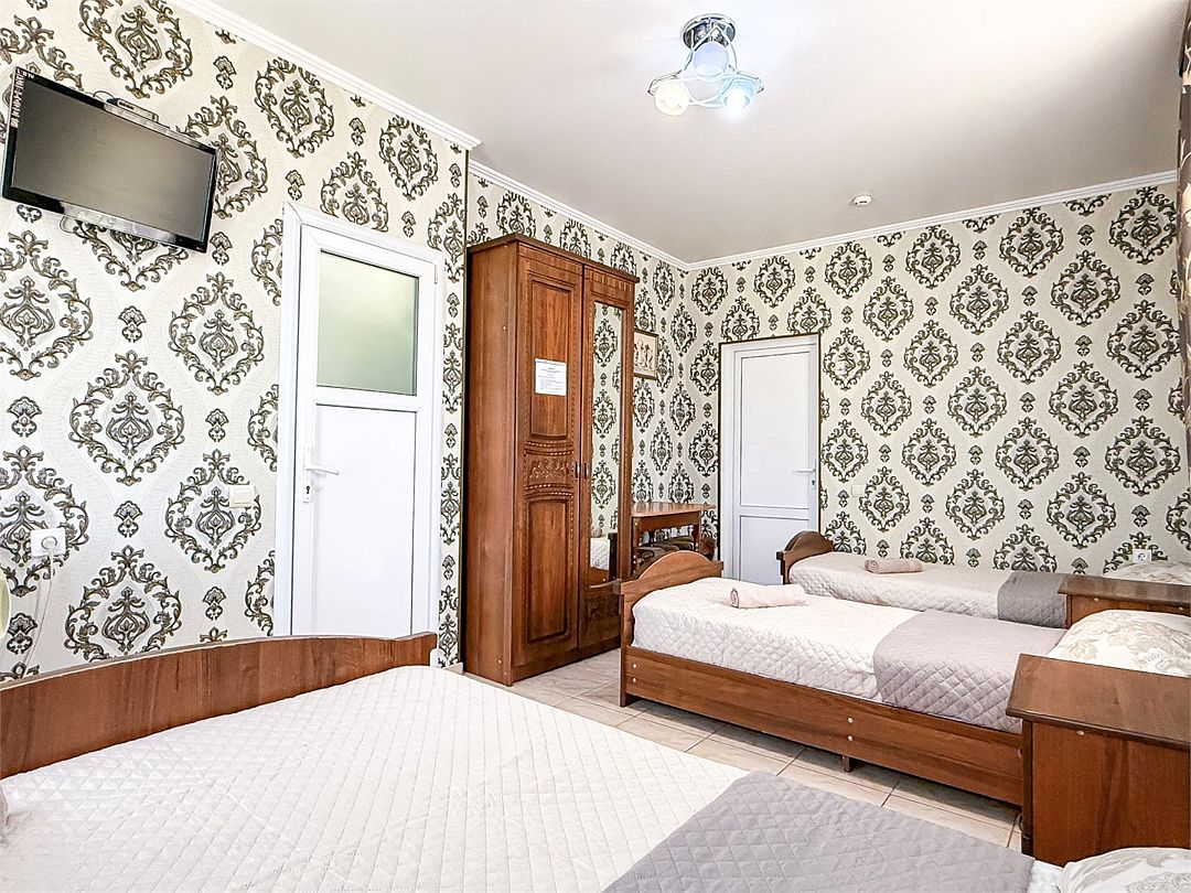 Трехместный номер площадью пятнадцать квадратных метров включает в себя: одну большую двуспальную кровать, одну односпальную кровать, стол, стулья, телевизор, шкаф, санузел с душевой и зеркалом.