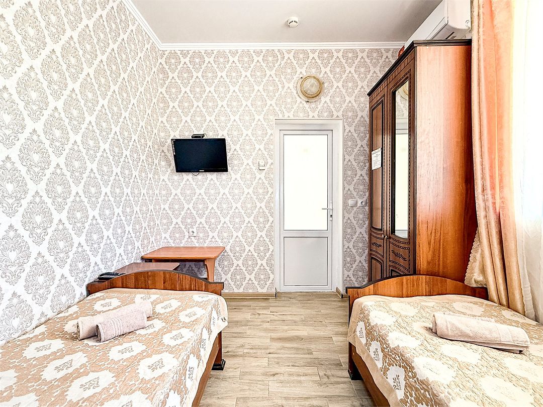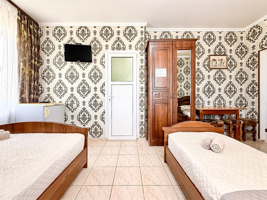 Двухместный номер площадью пятнадцать квадратных метров включает в себя: две односпальные кровати, телевизор, шкаф, стол, стулья, санузел с душевой и зеркалом.