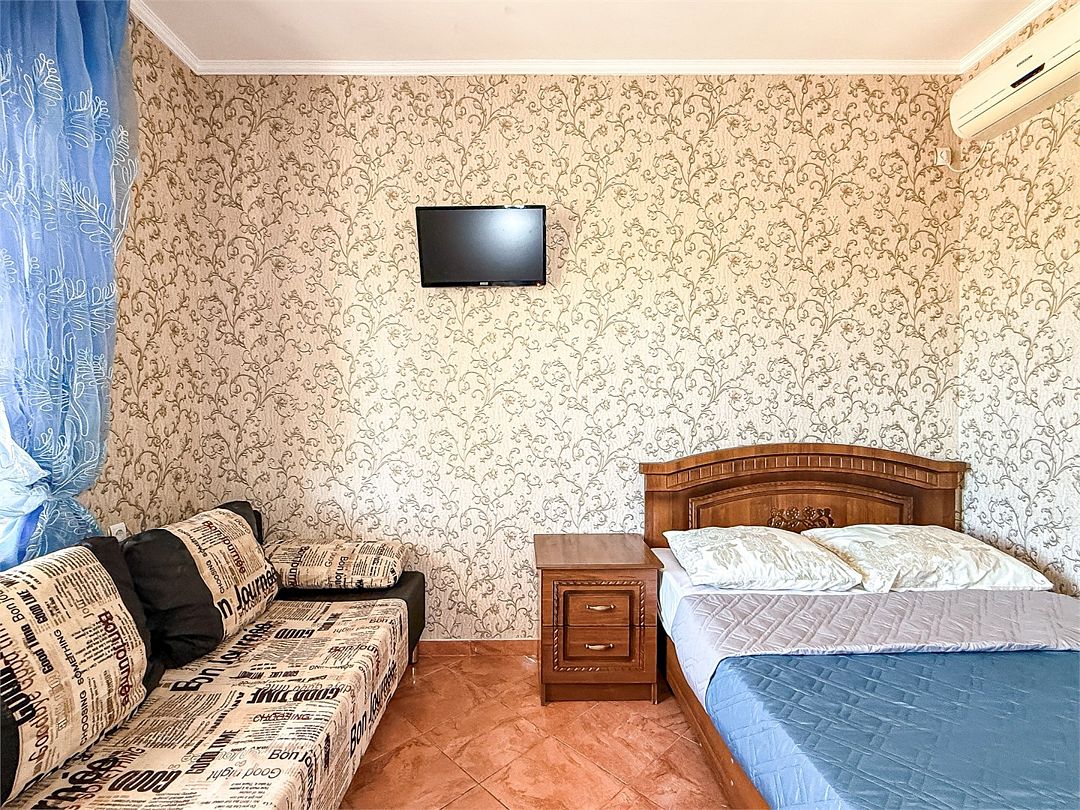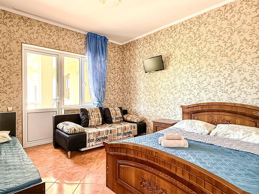 Пятиместный комфорт площадью двадцать восемь квадратных метров включает в себя: одну двуспальную кровать, диван двуспальный, одну односпальную кровать, холодильник, телевизор, шкаф, стол, стулья, санузел с душевой и зеркалом.