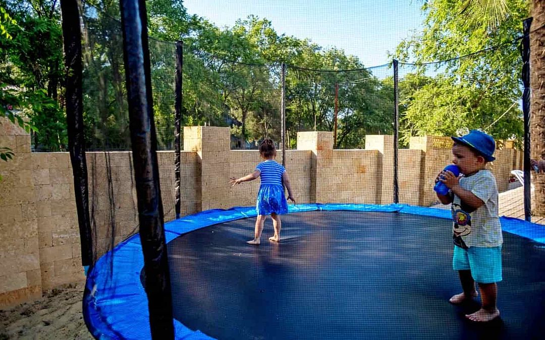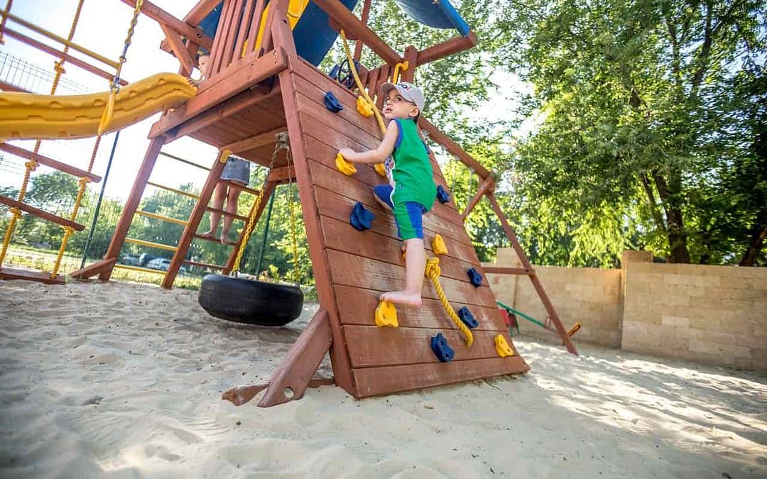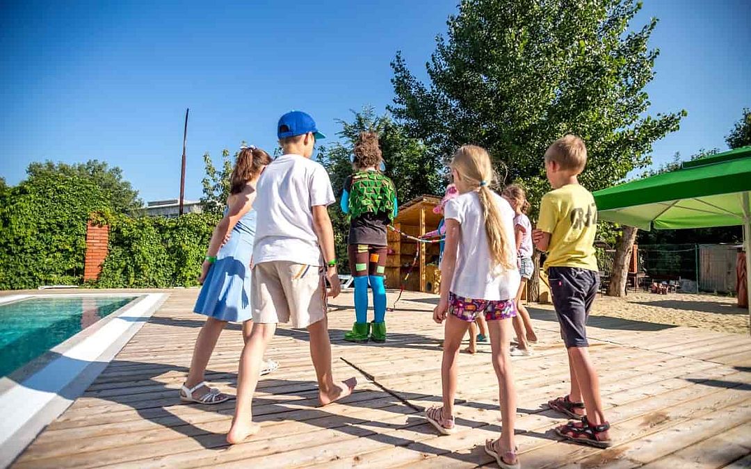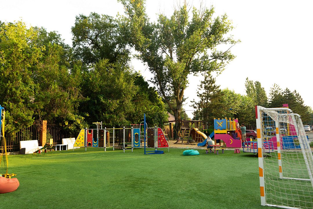 Детям в зависимости от возраста в пансионате предоставляются скидки, для них работают аниматоры, на территории организована детская площадка, в здании отеля есть игровая комната, а в бассейне – специальное детское отделение.