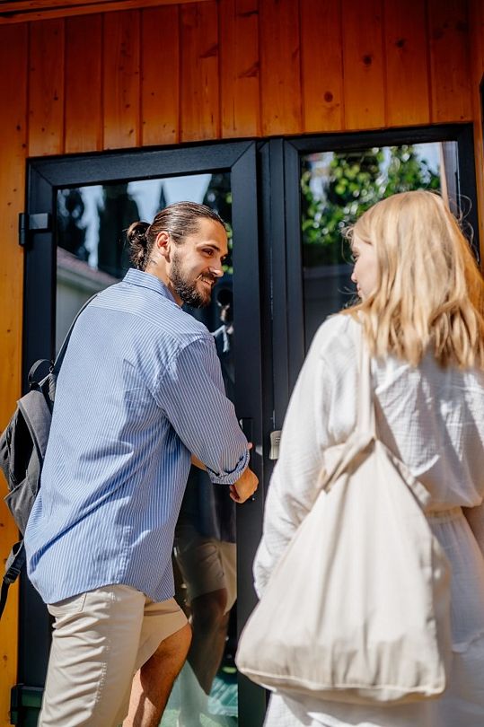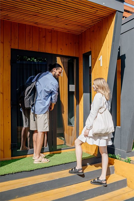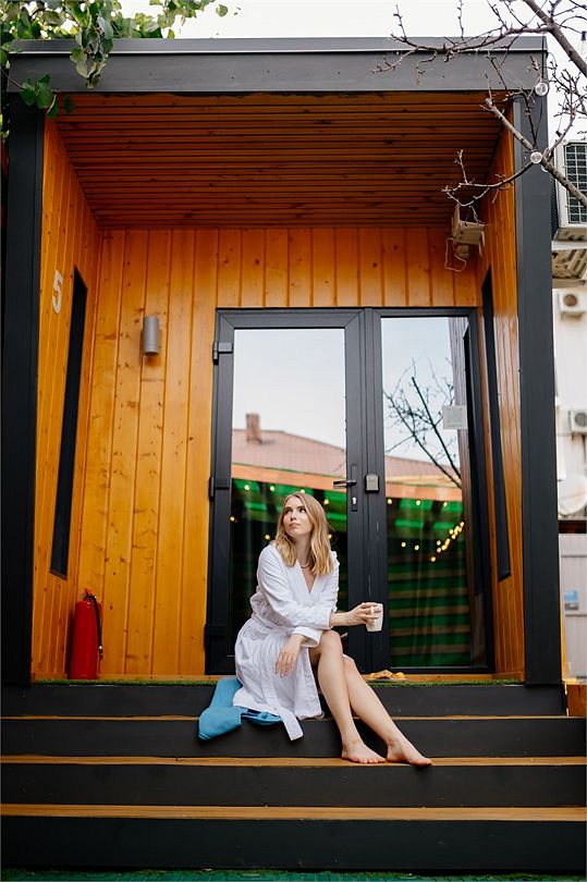 Дом 14м² - размещение до 2 человек. Небольшая гостиная, имеется мини-холодильник, чайник, кондиционер, TV, wi-fi. Спальное место двуспальная кровать (не раздвигается), также в доме собственный совмещенный с душем санузел. Имеется общая кухня, оснащена электрической плитой, микроволновой печью, капсульной кофемашиной, также к услугам гостей стиральная машина, утюг и гладильная доска. Уютная придомовая территория где для гостей имеется беседка, столы, лавочки и садовая качель. К услугам гостей за отдельную плату настоящая русская баня на дровах с купелями (действует предварительная бронь). На огороженной территории пять домов вместительность комплекса до 11 человек, возможны групповые заезды. Хорошая геолокация - до моря и ближайшего оборудованного пляжа 5 минут ходьбы, рядом множество кафе, столовых и ресторанов на любой вкус, детский парк аттракционов, супермаркет, остановка и аптека. Важно: Действует самостоятельное бесконтактное заселение, необходимо связаться предварительно для получения необходимых инструкций. Обязательный залог 5000 рублей вносится дополнительно при заселении и возвращается после выезда. Раннее заселение и поздний выезд возможны по предварительному согласованию (при наличии возможности) и за дополнительную плату. Парковка отсутствует.Услуги и удобства