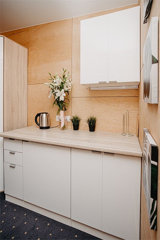 Общая кухня, оснащения всей необходимой техникой и кухонной утварью, имеется кофемашина, кулер, стиральная машина.