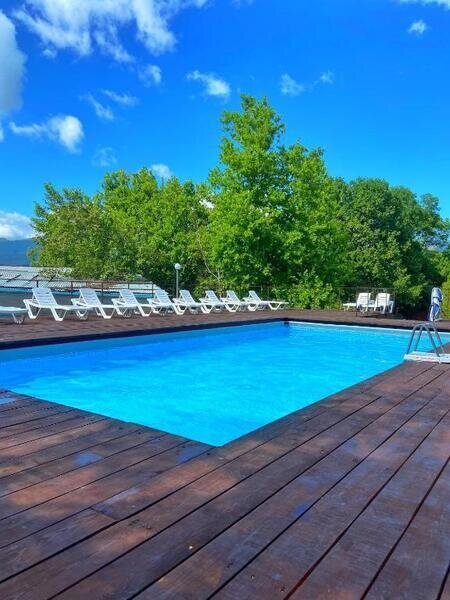 На территории базы отдыха гости могут насладиться большим, просторным бассейном. Вода в нем поддерживается на комфортной для купания температуре. Бассейн оборудован современной системой фильтрации, что обеспечивает безопасность и для детей. Проводится аква-аэробика и анимация у бассейна.