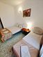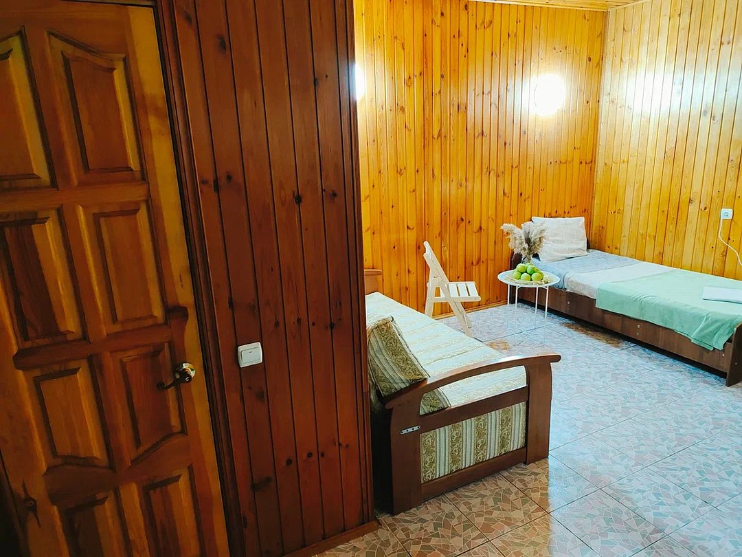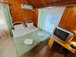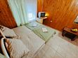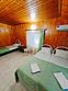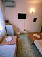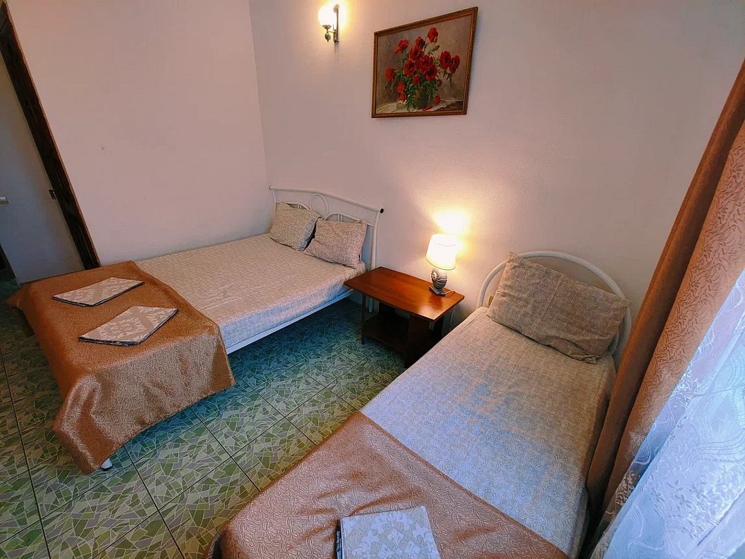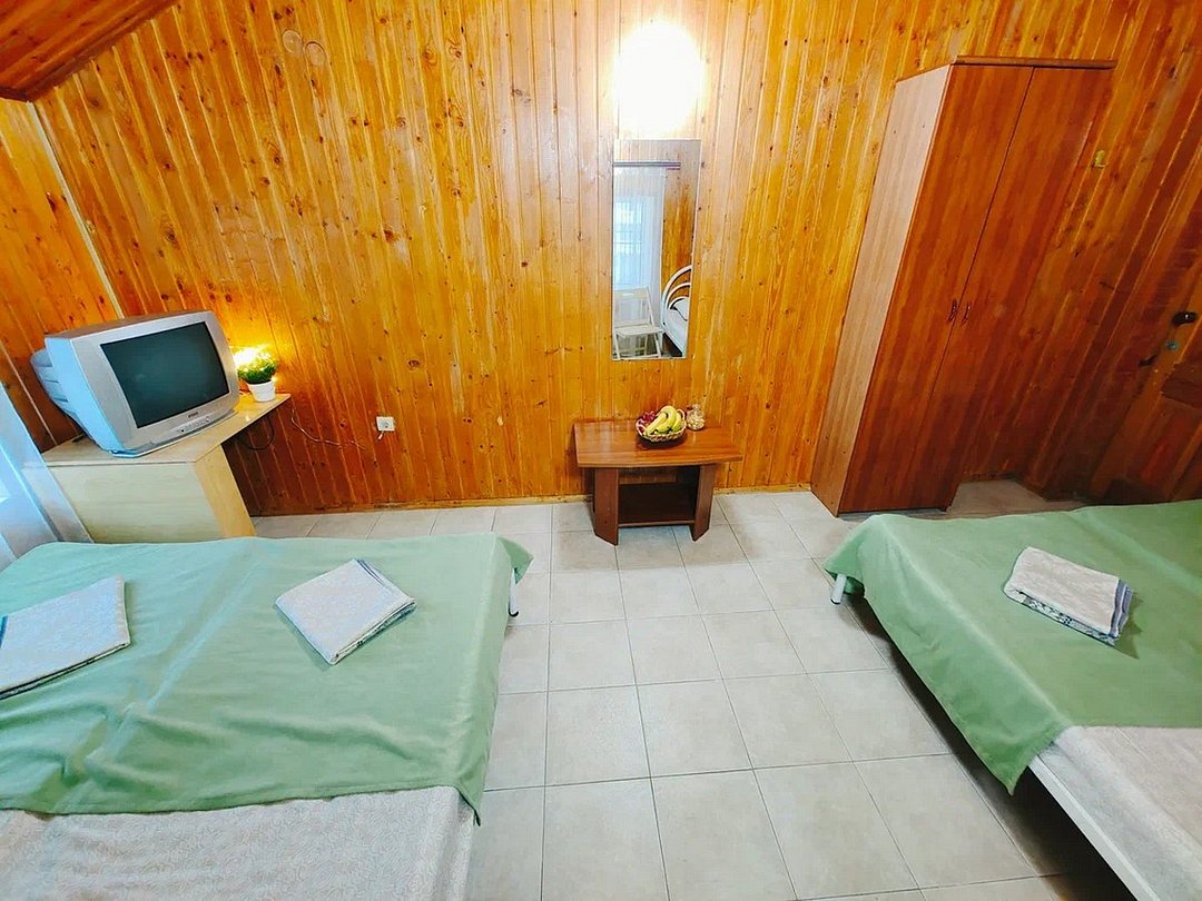 Номер оснащен: двуспальная кровать и односпальная кровать или три односпальные, прикроватные тумбочки, журнальный столик, зеркало, шкаф, кондиционер, телевизор. Душ и туалет на этаже.