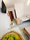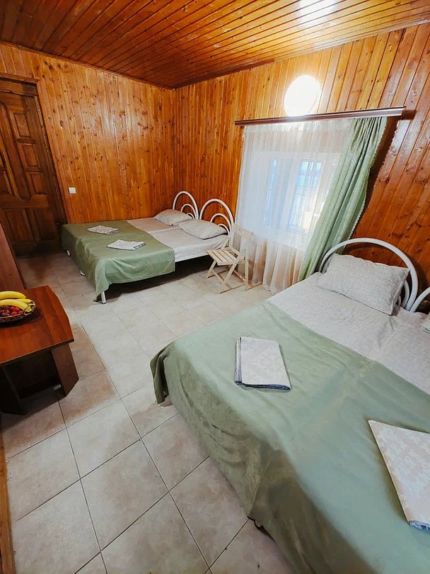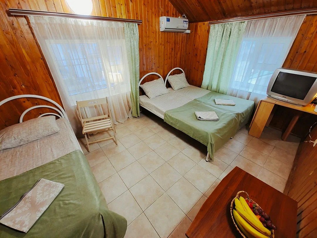 Номер оснащен: двуспальная кровать и две односпальные кровати, прикроватные тумбочки, журнальный столик, зеркало, шкаф, кондиционер, телевизор. Душ и туалет на этаже.