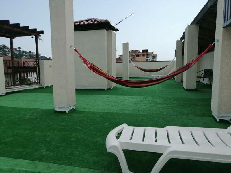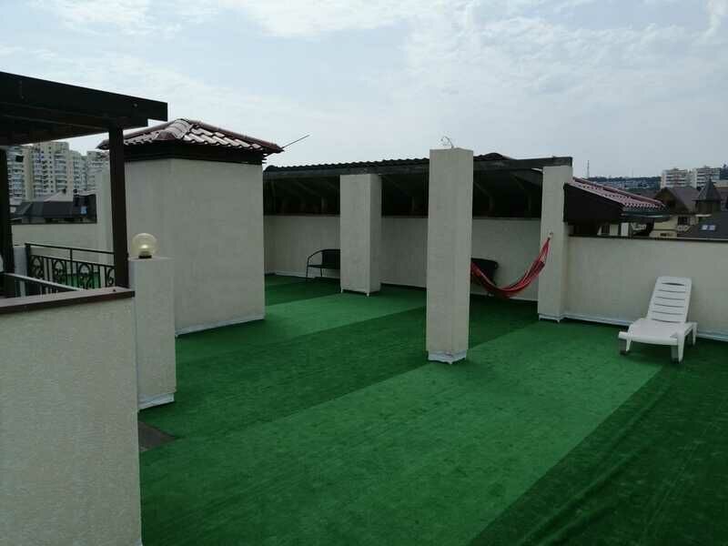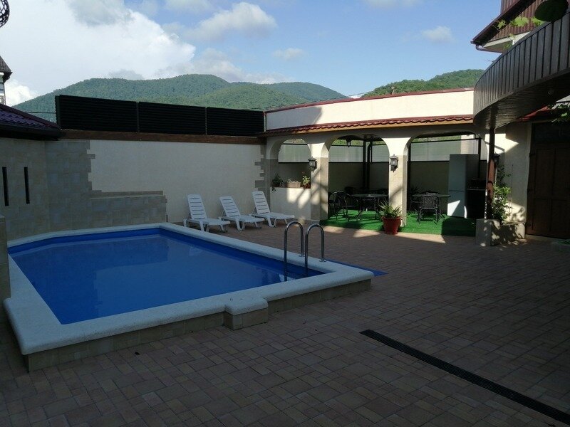 На территории гостевого дома расположен подогреваемый бассейн, летняя кухня под навесом с обеденными столами, плитой, микроволновой печью, чайником, холодильником, а также посудой и столовыми принадлежностями. Во дворе имеется мангал, детская площадка, батут, эксплуатированная крыша и зона отдыха.