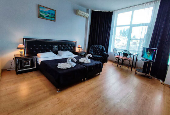 2 односпальные кровати (сдвижные/ раздвижные), тумбочки, фен, шкаф, столик, 2 стула, ванная комната (туалет, ванная), жк-телевизор, чайник, балкон, вид на море