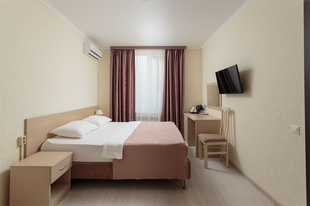 Стандартный двухместный номер площадью 12 квадратных метров. На выбор гостей спальные места в комнате представлены: одной широкой двуспальной кроватью размера «king size» или двумя односпальными кроватями.