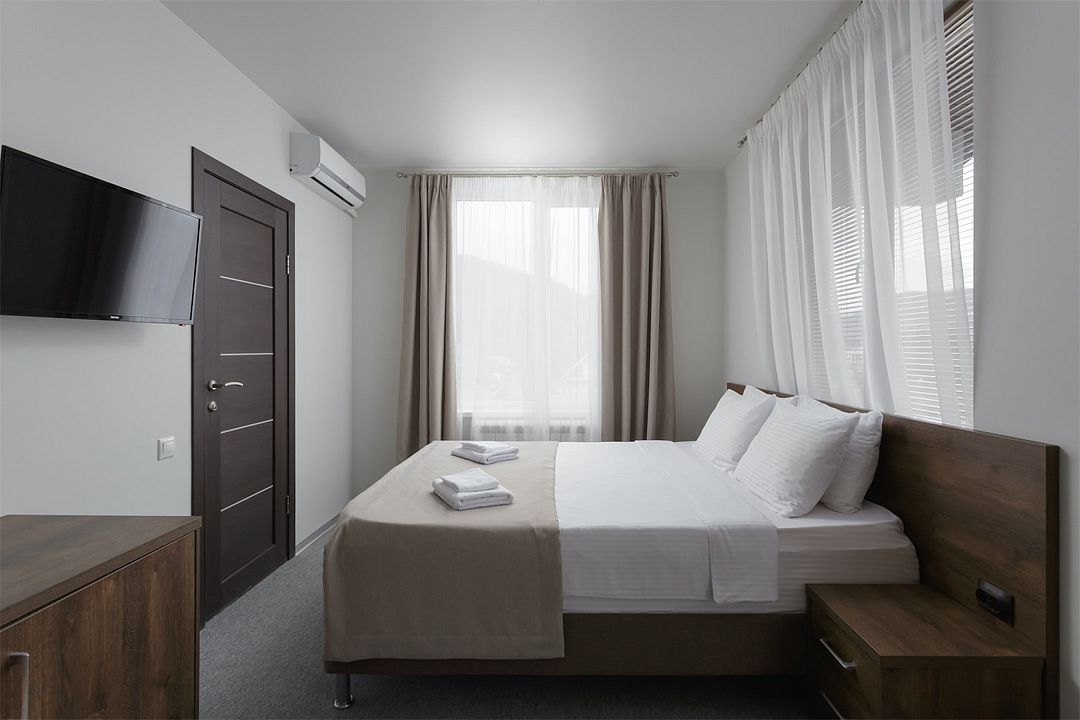 Прекрасная, уютная атмосфера!Все по домашнему) , отзывчивый и вежливый персонал , всегда помогают во всем ! В столовой очень вкусная еда! Недалеко подъемники , бесплатный трансфер , балкон с видом на горы . Номера чистые, уютные. Открылся новый корпус , есть апартаменты с собственной кухней)
