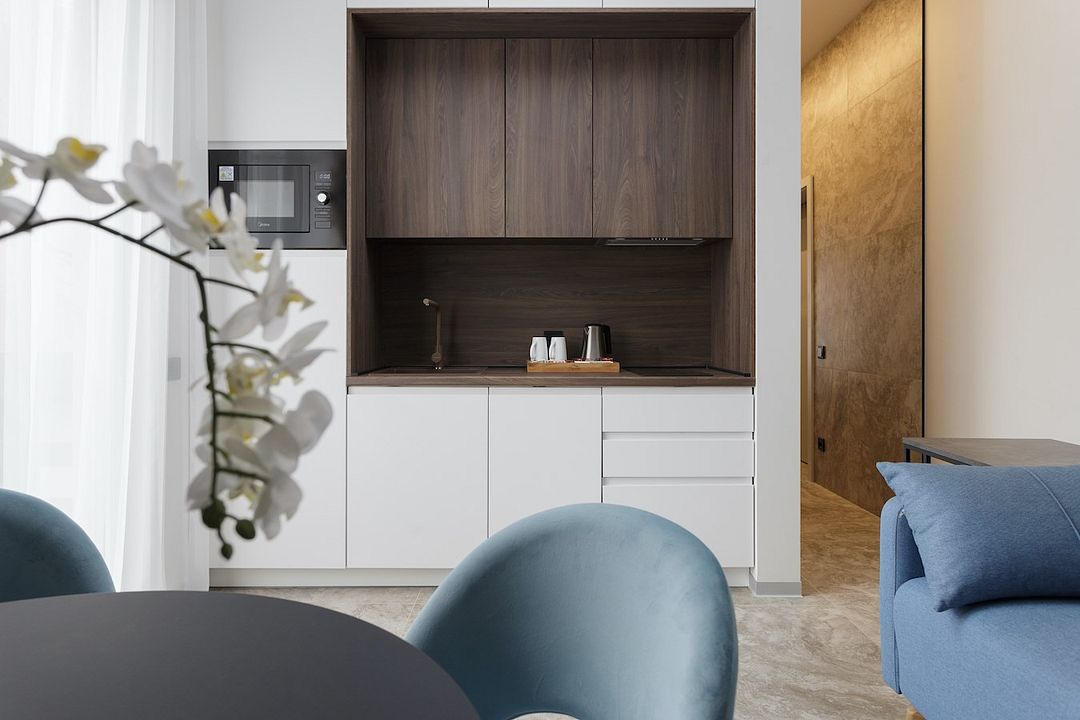 В апартаментах есть: Wi-Fi, варочная панель, СВЧ, холодильник, сплит-система, управление температурой обогрева в помещении, TV с функцией Smart, обеденная зона, чайная станция (чайник, чай, сахар), фен, утюг, сейф. Апартаменты оснащены собственной ванной комнатой с душем, туалетом и косметическими принадлежностями.
