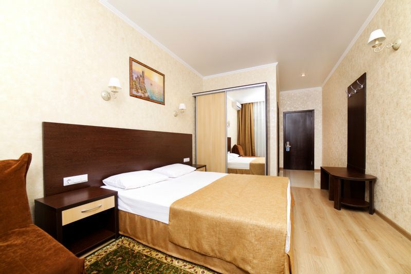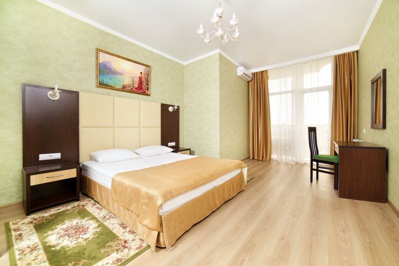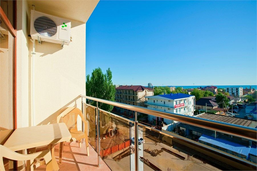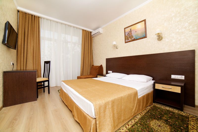 Wi-Fi, кондиционер, светильник, фен, будильник, электронные замки, ванна, санузел, банные полотенца, гигиенические средства, балкон, две односпальные или большая двуспальная кровать, тумбы, шкаф для одежды, вешалки, журнальный столик, письменный стол, багажная тумба, зеркало, письменные принадлежности, набор посуды, информационная карта, меню, сейф, чайник, раковина, вид на море, кулер на этаже, вид во двор, ламинат, стул, раскладное кресло, внутренний телефон, телевизор с плоским экраном, мини-холодильник, частичный вид на море, без питомцевВ гостиничном номере