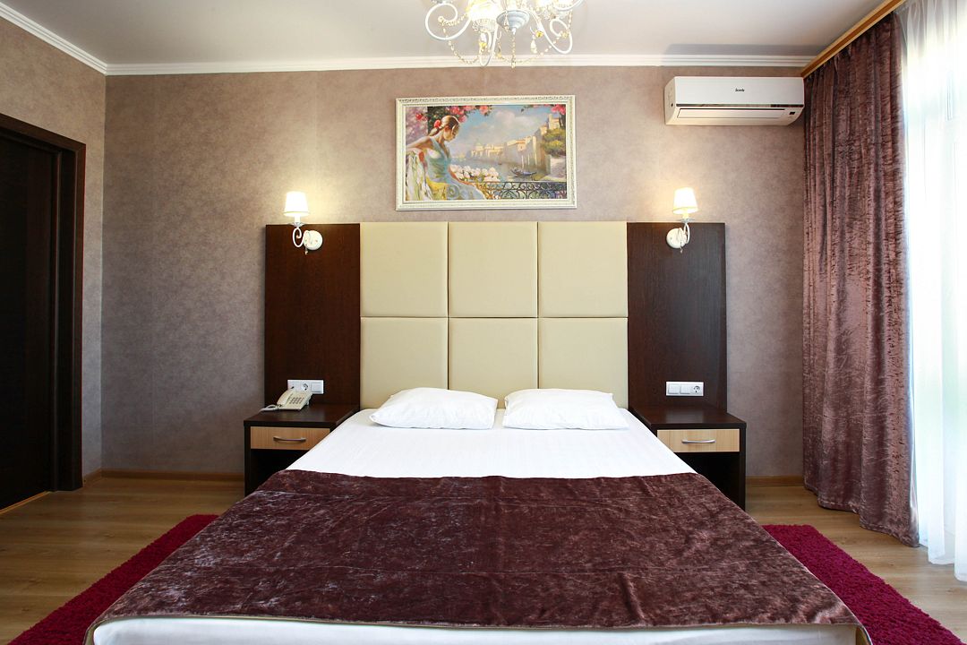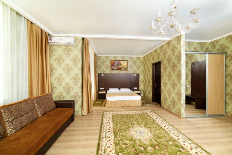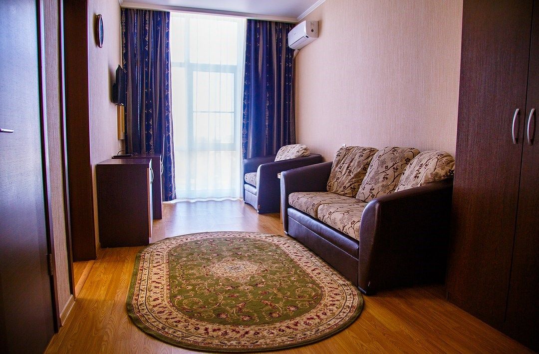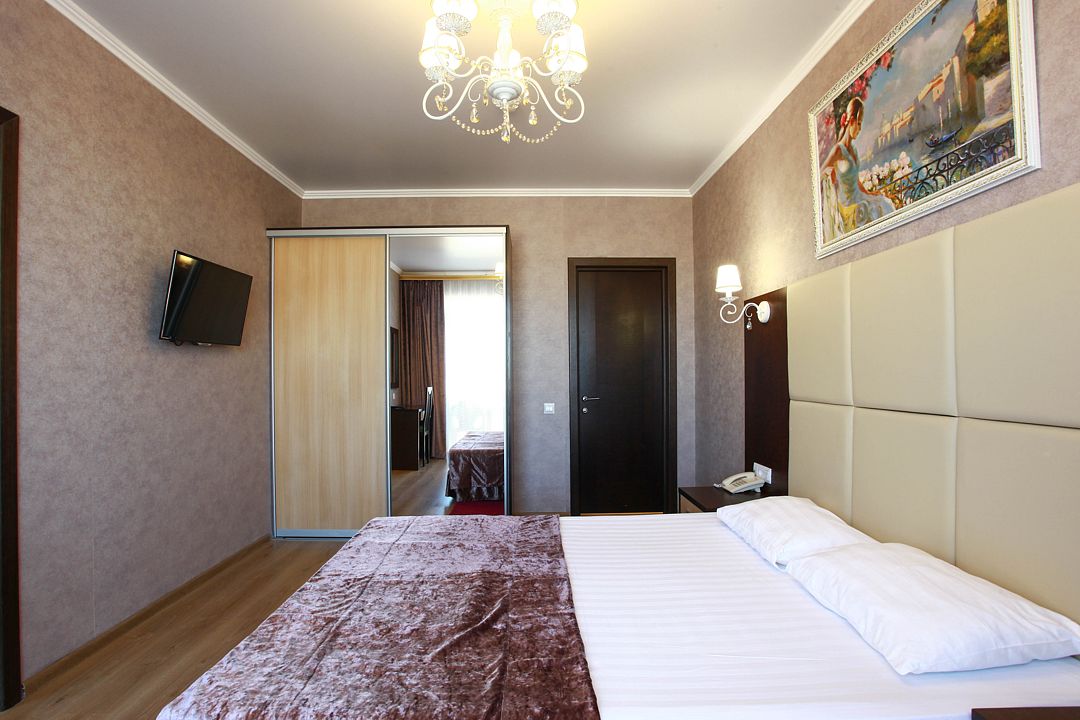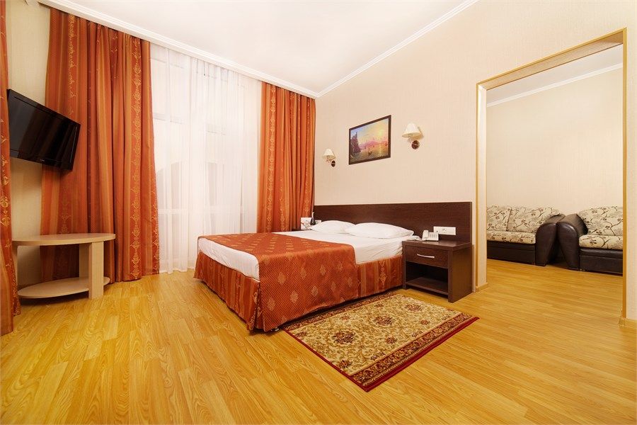 В номере: в спальне двуспальная кровать, в гостиной - уголок с мягкой мебелью, телевизор, мини-холодильник, сплит-система, сейф, совместная ванная комната с санузлом, с ванными принадлежностями, фен, балкон.
