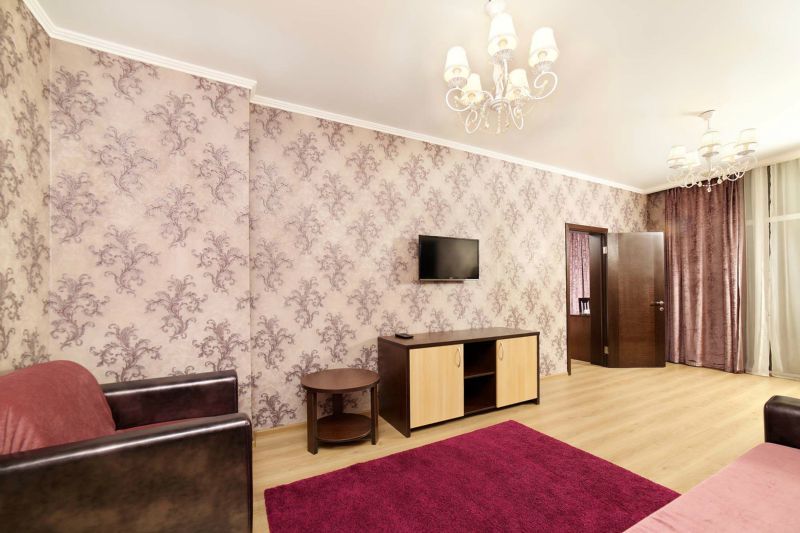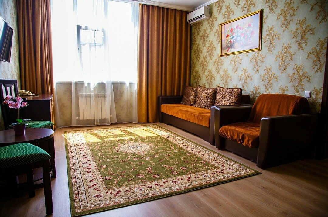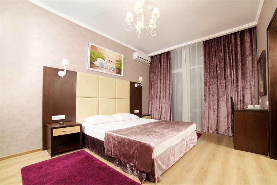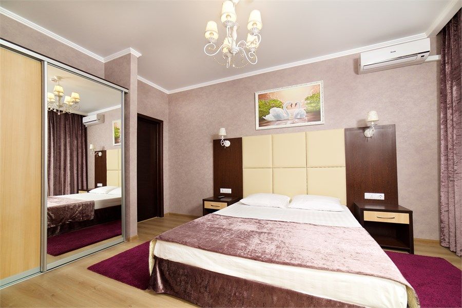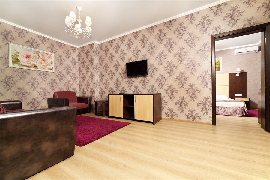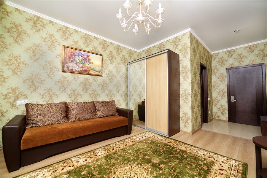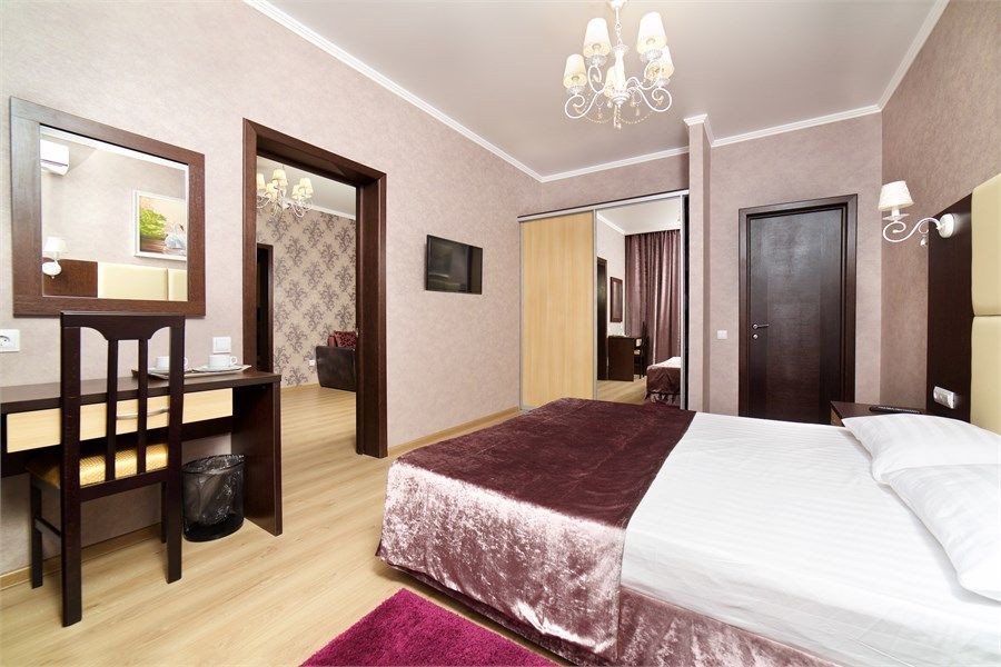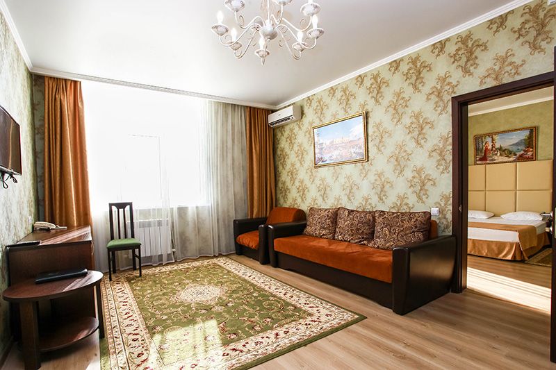 Уютный, просторный двухкомнатный номер. Современный интерьер оформлен в теплых бежевых тонах с нотками оттенка сирени или изумрудного камня. В спальне двуспальная кровать, в гостиной- современная мягкая мебель, балкон. Возможно размещение 2-х человек на основных местах +2 дополнительных места на диване.Услуги и удобства