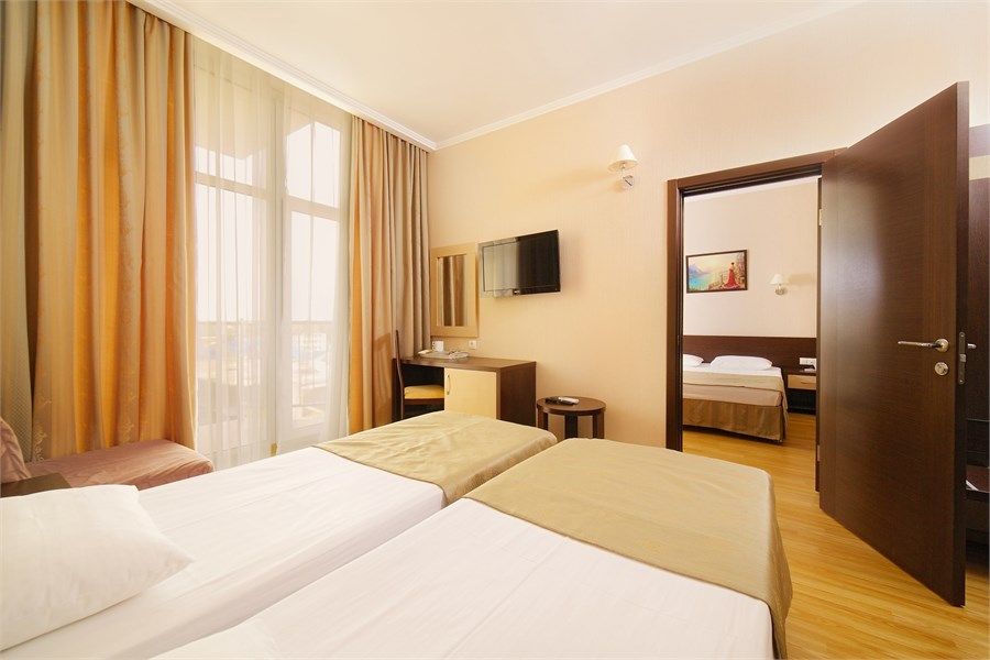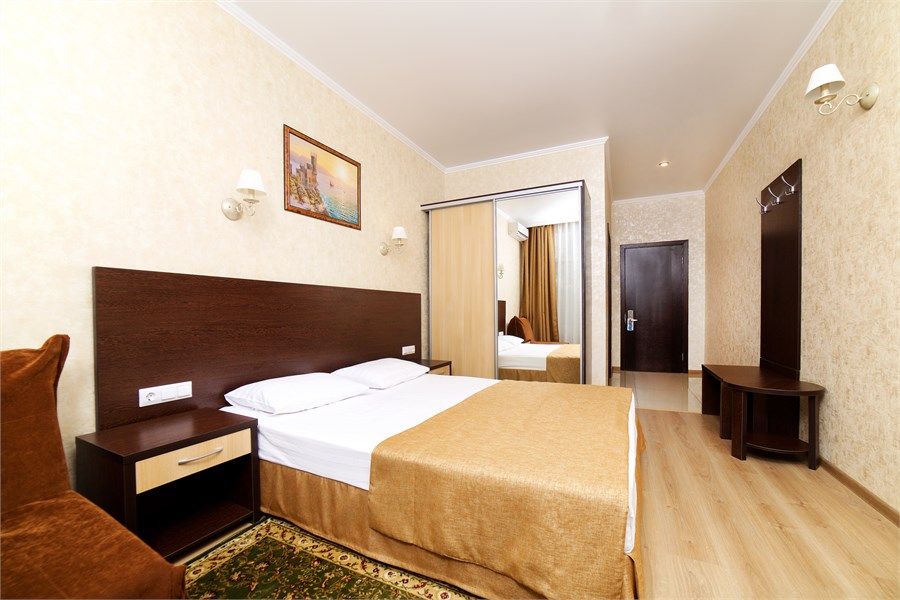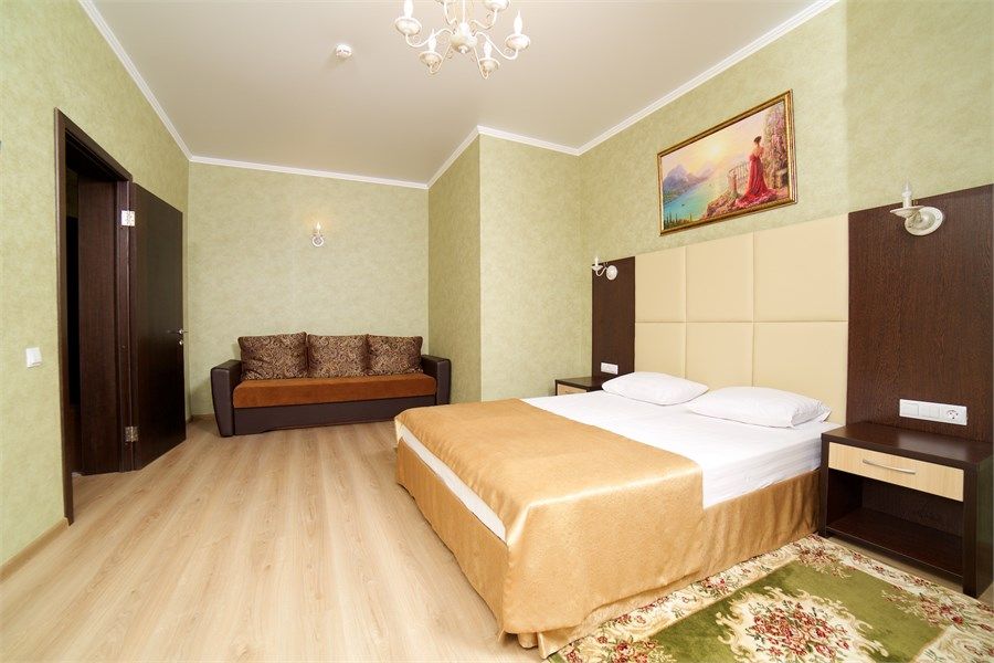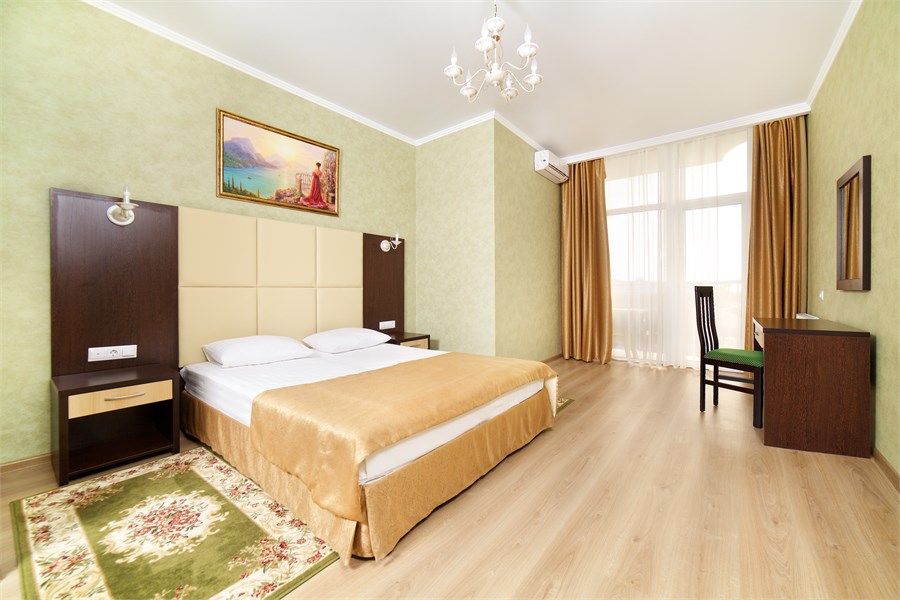 В номере: одна двуспальная и кровать, раскладной диван, телевизор, мини-холодильник, сплит-система, сейф, совмещенный санузел с ванной, с ванными принадлежностями, фен, балкон.
