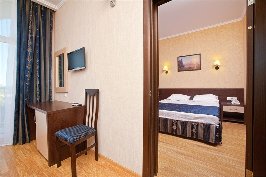два телевизора, Wi-Fi, фен, будильник, электронные замки, ванная комната, ванна, санузел, халаты, банные полотенца, пляжные полотенца, тапочки, гигиенические средства, балкон, двуспальная кровать, диван, тумбы, стулья, журнальный столик, письменный стол, багажная тумба, зеркало, две комнаты, набор посуды, информационная карта, меню, сейф, чайник, раковина, мягкая мебель, кулер на этаже, кресло, вид во двор, сплит-система, внутренний телефон, телевизор с плоским экраном, мини-холодильник, шкаф-купе, частичный вид на море, без питомцевВ гостиничном номере
