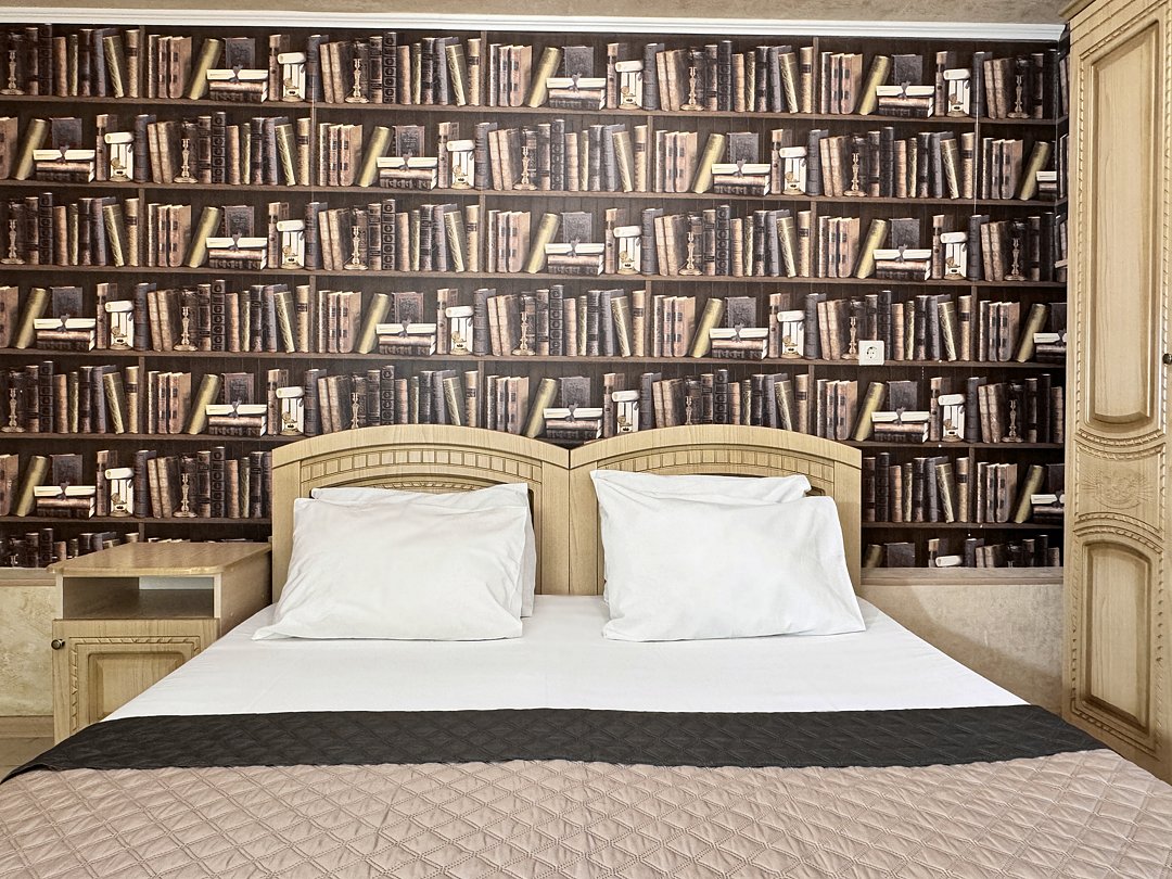 Номер оснащен: двуспальная кровать или две односпальные кровати прикроватные тумбочки, шкаф, туалетный столик, зеркало, телевизор, мини-холодильник, кондиционер, журнальный столик, стул.