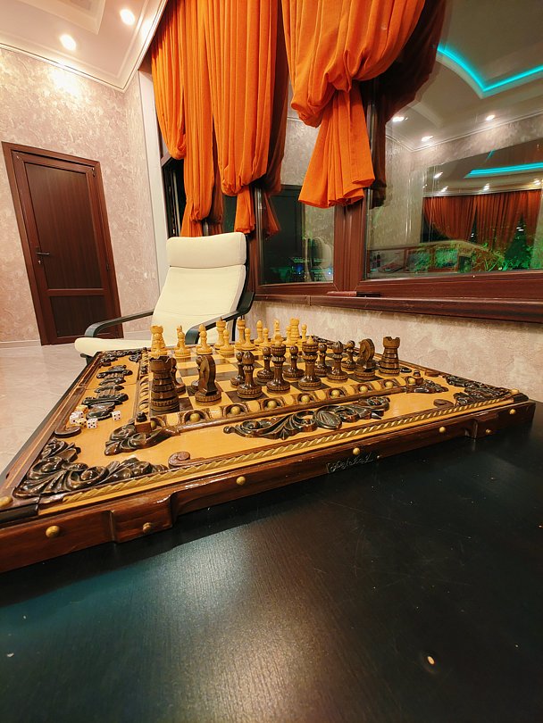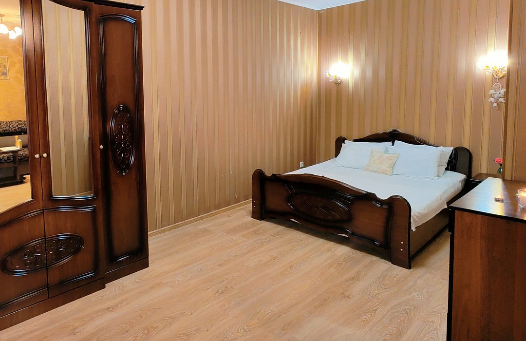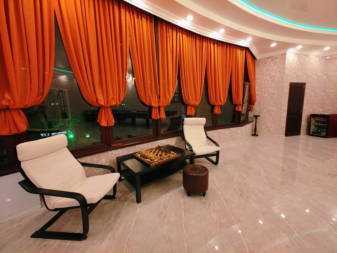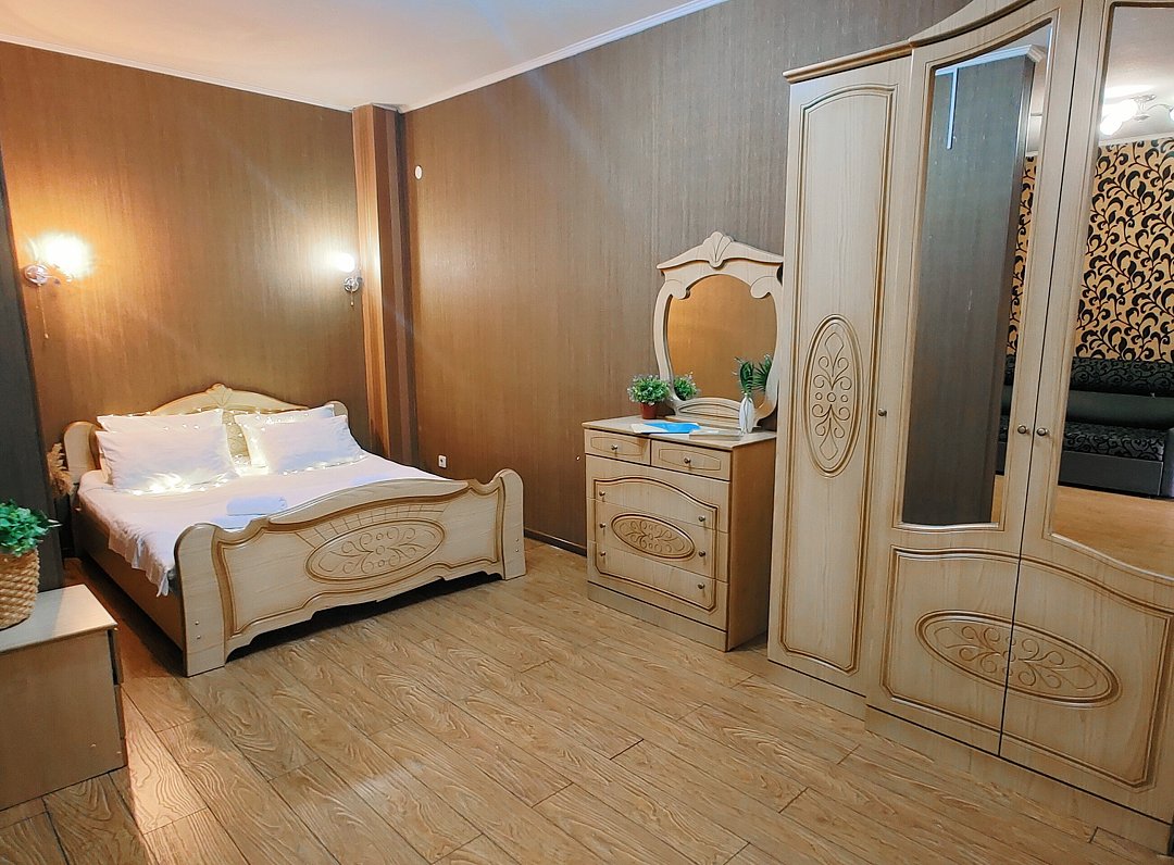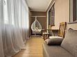 Номер оснащен: двуспальная кровать, кресло-кровать, прикроватные тумбочки, комод, зеркало, шкаф, телевизор, мини-холодильник, кондиционер, кресло-кокон.