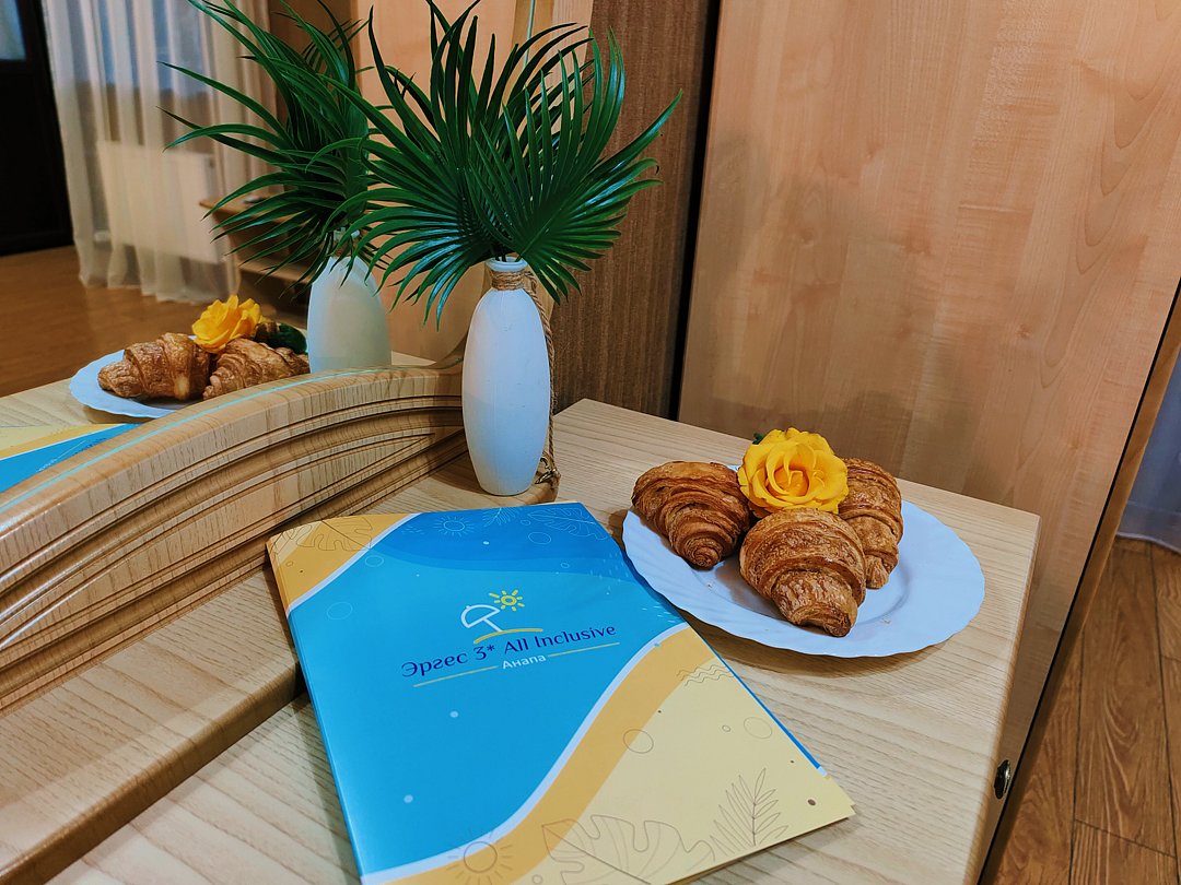 Двухместный небольшой номер с видом на столовую и территорию. Номер оснащен: двуспальная кровать, прикроватные тумбочки, шкаф, журнальный столик, туалетный столик, зеркало, стул, телевизор, мини-холодильник, кондиционер. В номере имеется небольшая лоджия с видом на столовую и территорию отеля.