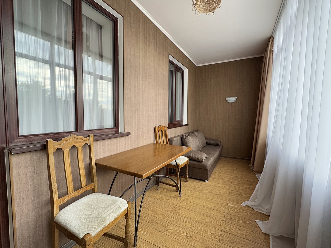 В номере имеется небольшая лоджия с видом на столовую и территорию отеля.