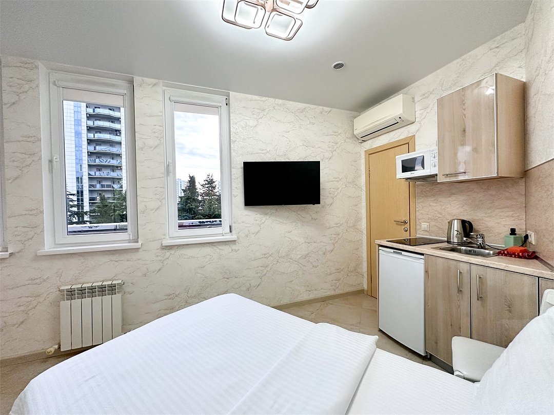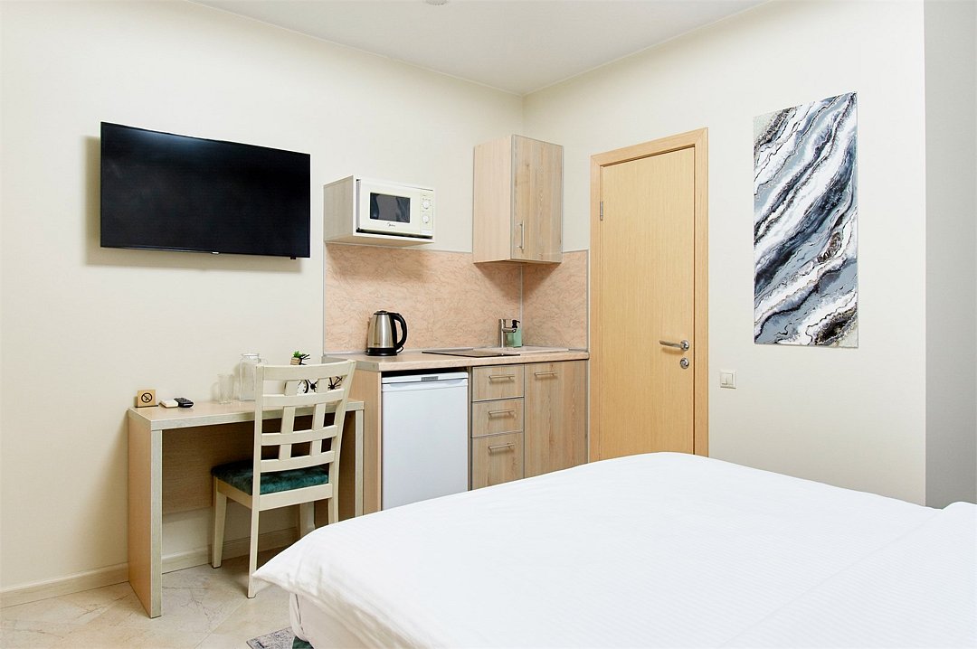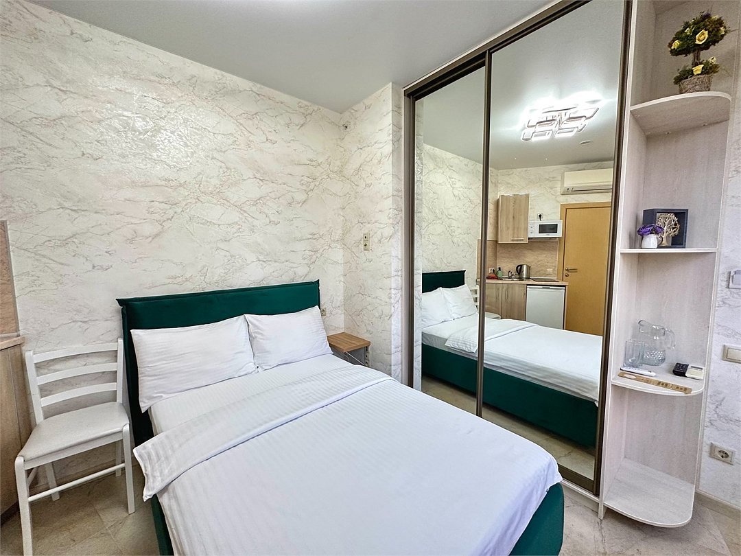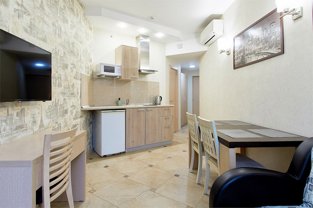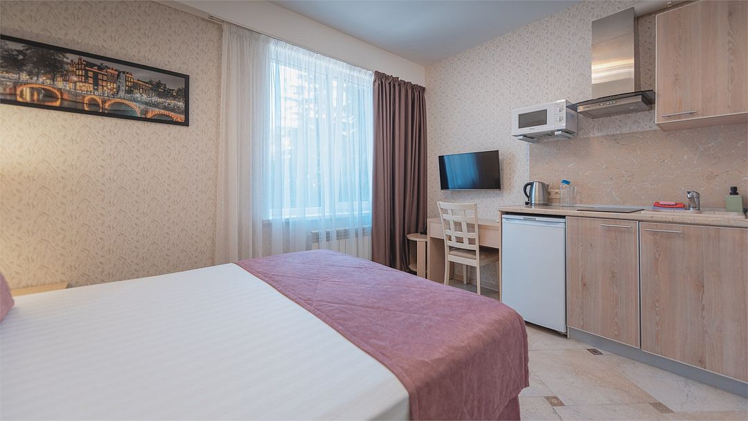 Однокомнатный номер с двухместной кроватью, кухня с микроволновой печью, холодильником, электрическими конфорками, вытяжкой воздуха, раковиной, так же в номере установлена сплит система , телевизор, сан.узел с душем и феном, две прикроватные тумбы, шкаф, настенная вешалка с зеркалом, стол под телевизор, коктейльный столик, стул, стационарный телефон, сейф, стандартный комплект посуды.Услуги и удобства