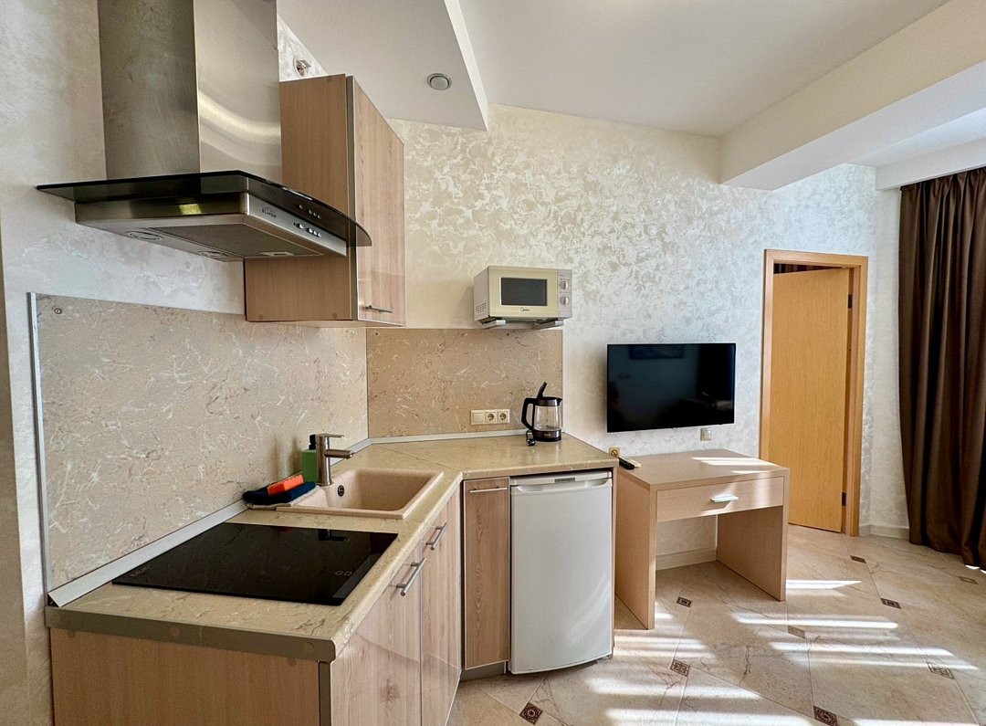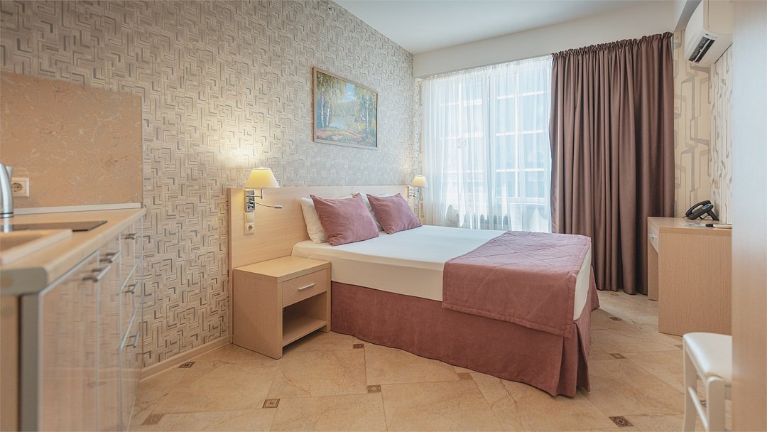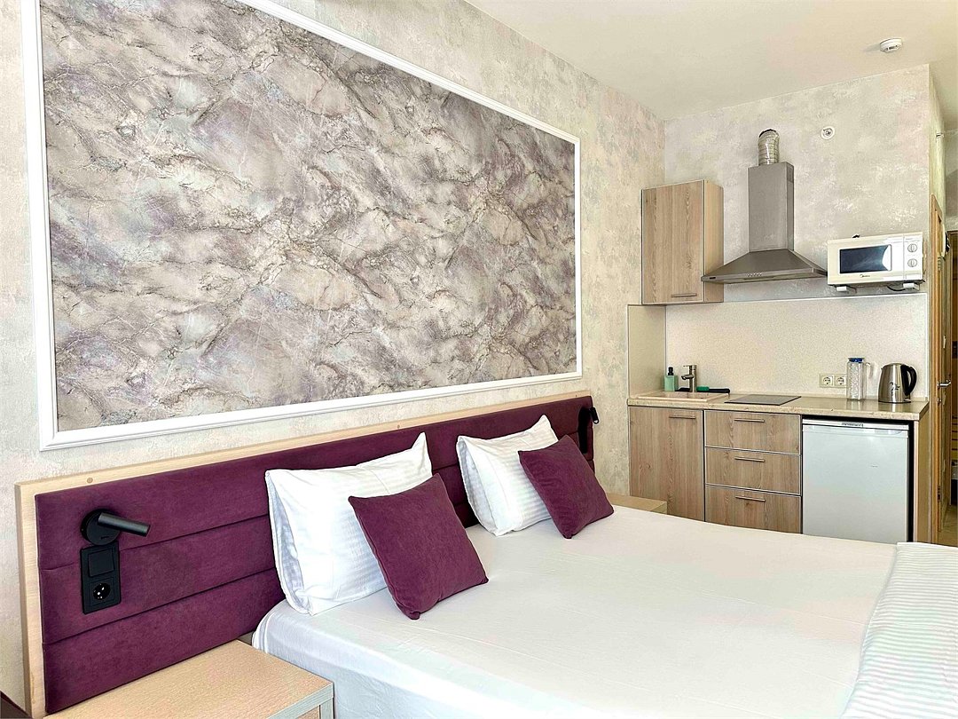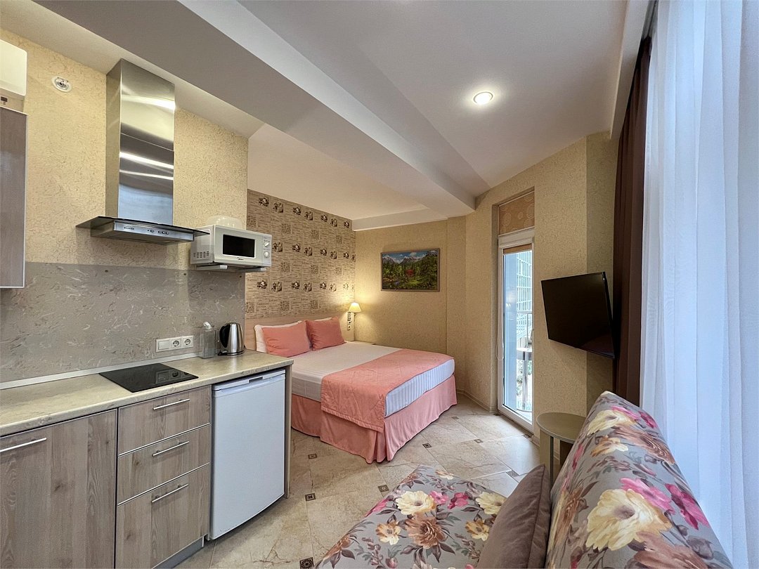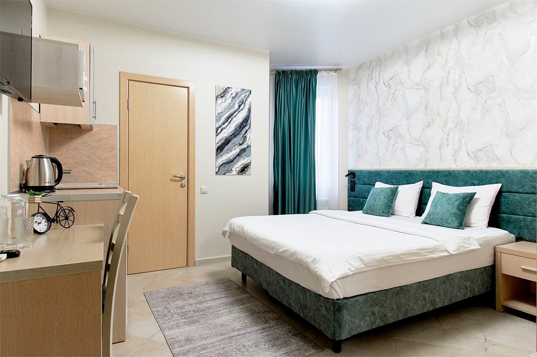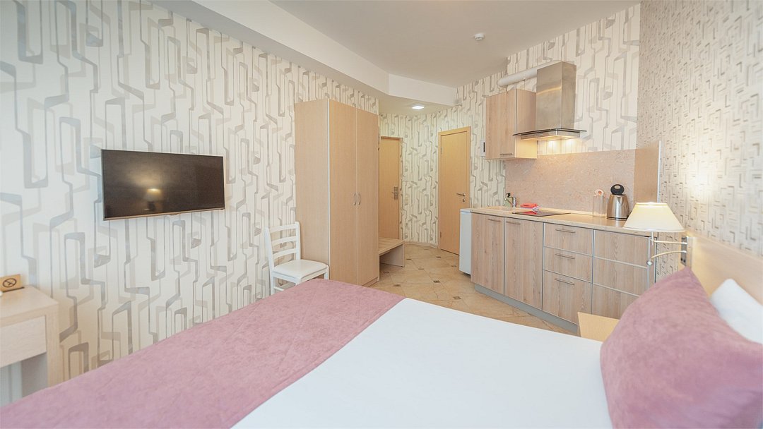 Однокомнатный номер с двухместной кроватью, кухня с микроволновой печью, холодильником, электрическими конфорками, вытяжкой воздуха, раковиной, так же в номере установлена сплит система , телевизор, сан.узел с душем и феном, две прикроватные тумбы, шкаф, настенная вешалка с зеркалом, стол под телевизор, коктейльный столик, стул, стационарный телефон, сейф, стандартный комплект посуды.Услуги и удобства