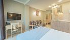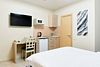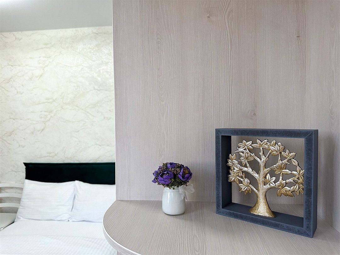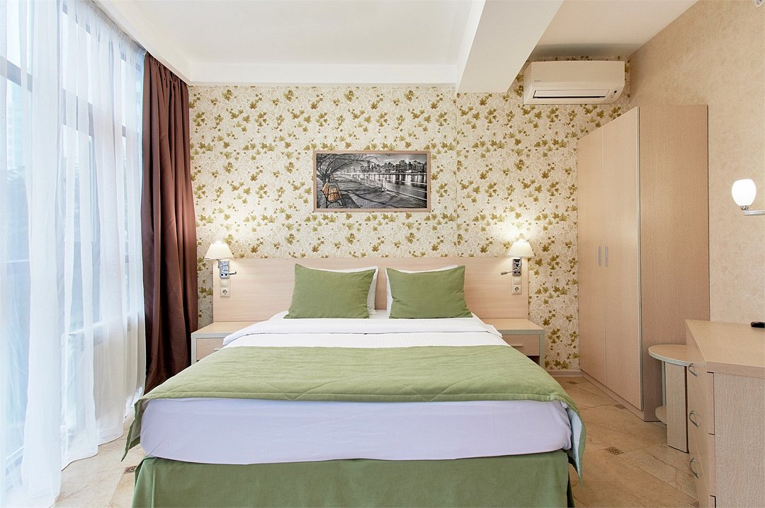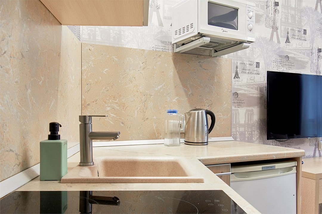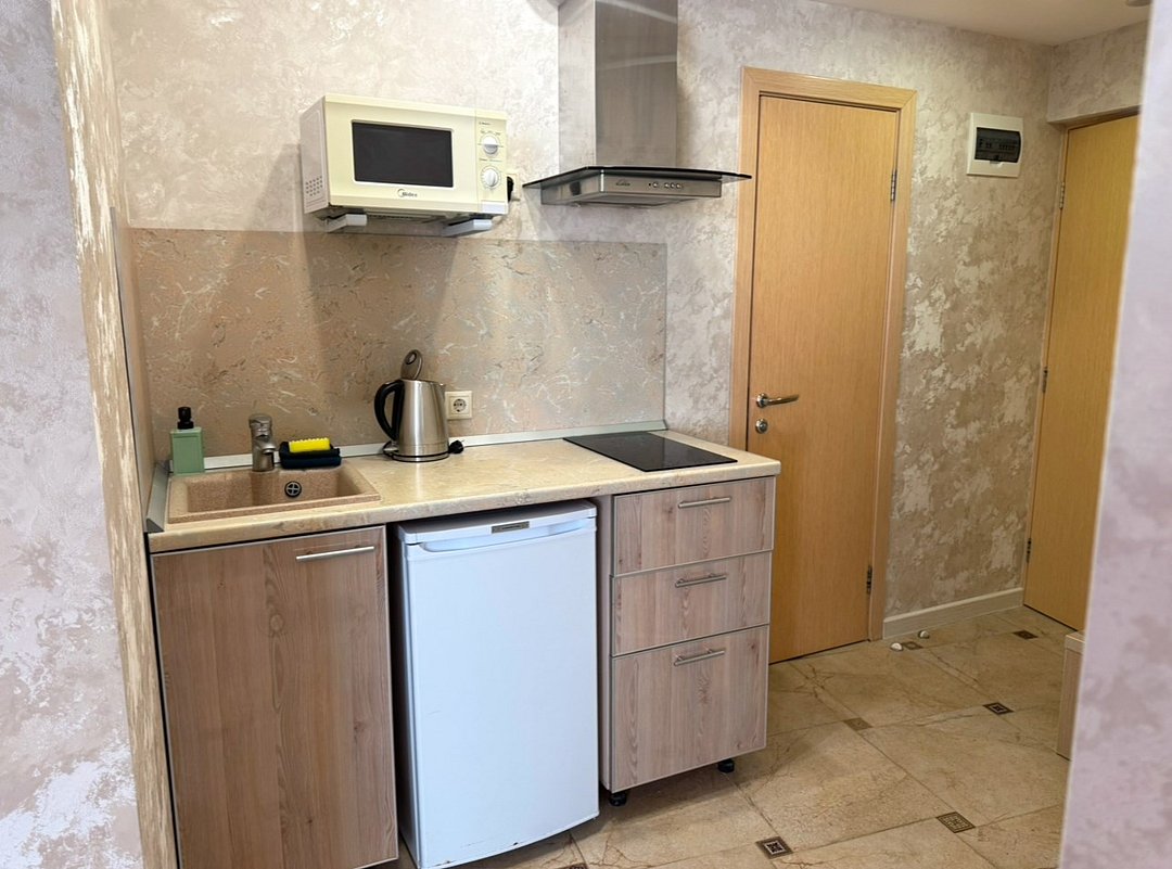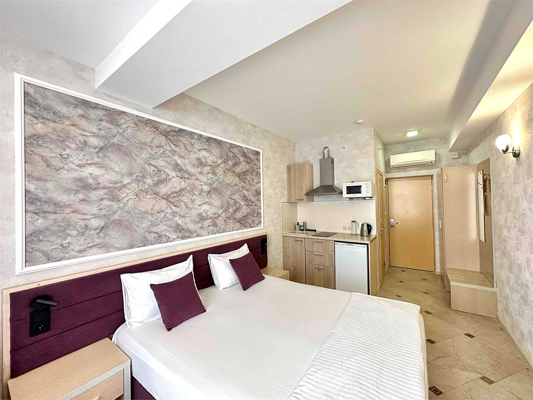 Однокомнатный номер с двухместной кроватью, кухня с микроволновой печью, холодильником, электрическими конфорками, вытяжкой воздуха, раковиной, так же в номере установлена сплит система , телевизор, сан.узел с душем и феном, две прикроватные тумбы, шкаф, настенная вешалка с зеркалом, стол под телевизор, коктейльный столик, стул, стационарный телефон, сейф, стандартный комплект посуды.Услуги и удобства