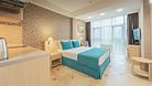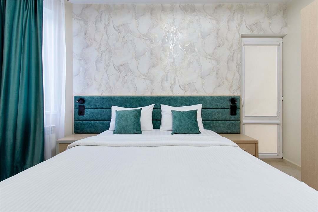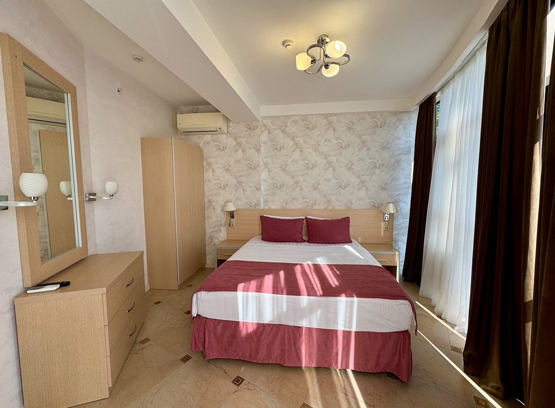Однокомнатный номер с двухместной кроватью и кресло-кроватью, кухня с микроволновой печью, холодильником, электрическими конфорками, вытяжкой воздуха, раковиной, так же в номере установлена сплит система , телевизор, сан.узел с душем и феном, две прикроватные тумбы, шкаф, вешалка с зеркалом, стол под телевизор, коктейльный столик, стул, стационарный телефон, сейф, стандартный комплект посуды.Услуги и удобства