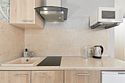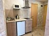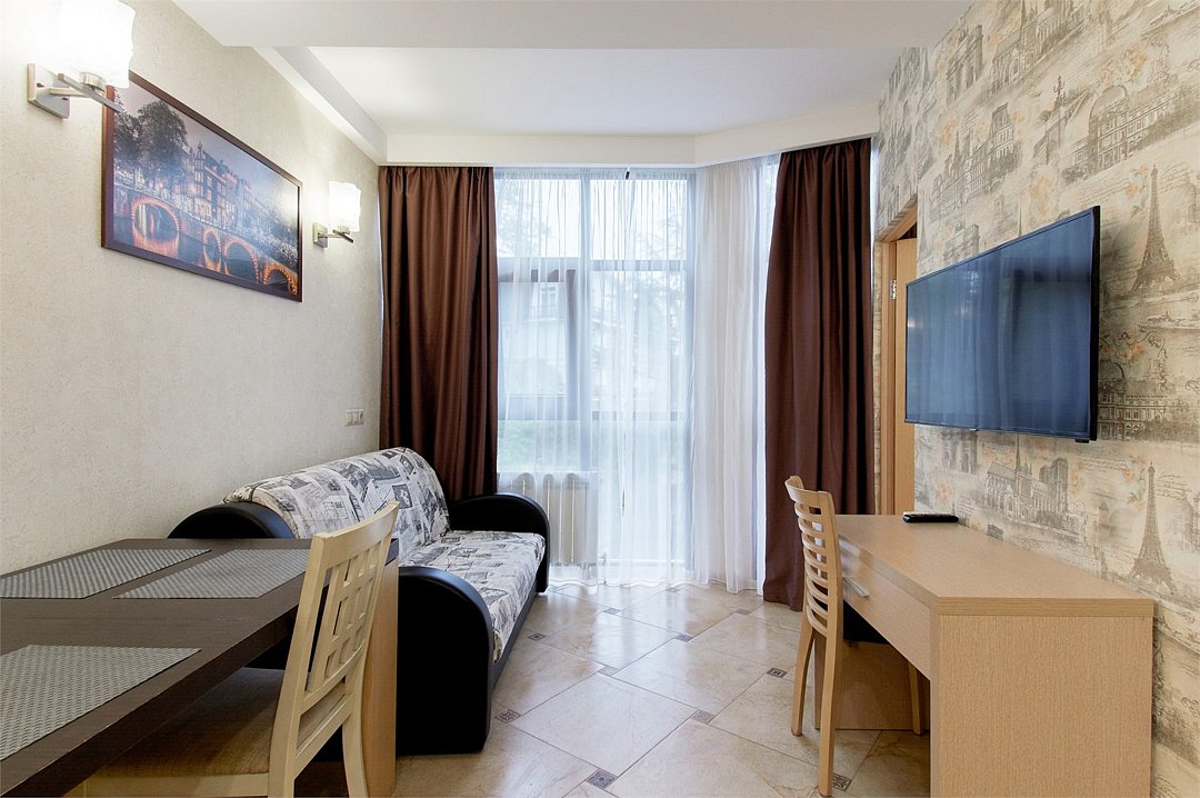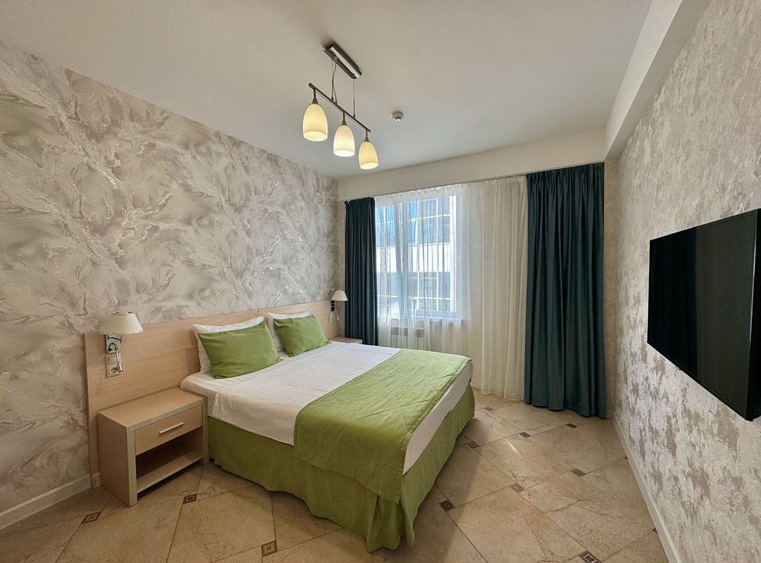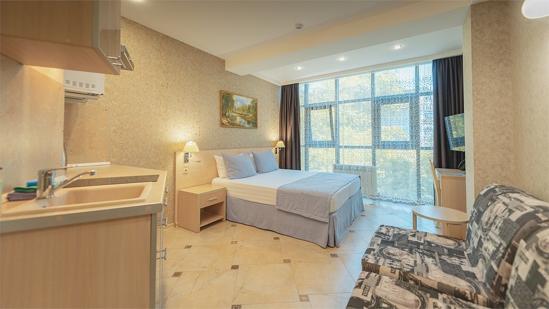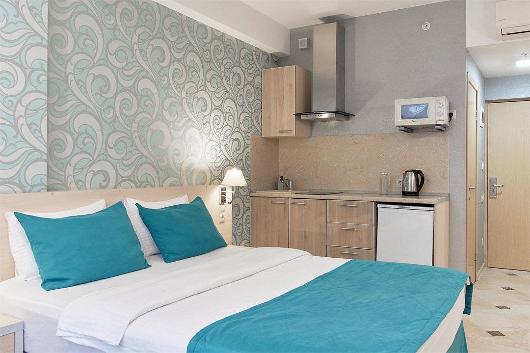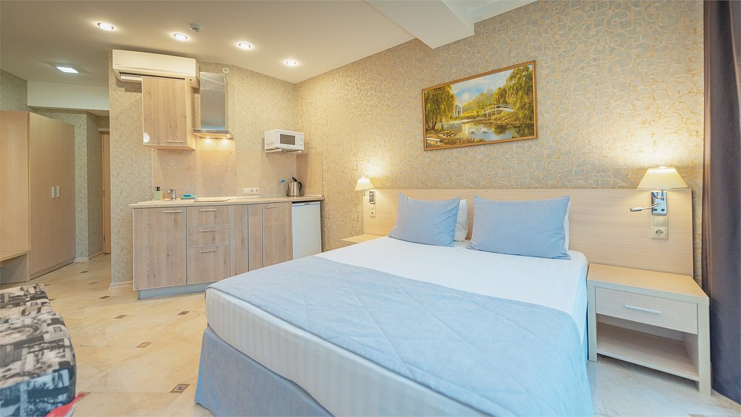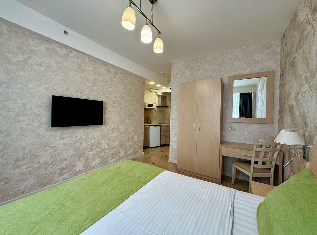 Однокомнатный номер с двухместной кроватью, кресло-кровать, кухня с микроволновой печью, холодильником, электрическими конфорками, вытяжкой воздуха, раковиной, так же в номере установлена сплит система , телевизор, сан.узел с душем и феном, две прикроватные тумбы, шкаф, вешалка с зеркалом, стол под телевизор, коктейльный столик, стул, стационарный телефон, сейф, стандартный комплект посуды.Услуги и удобства