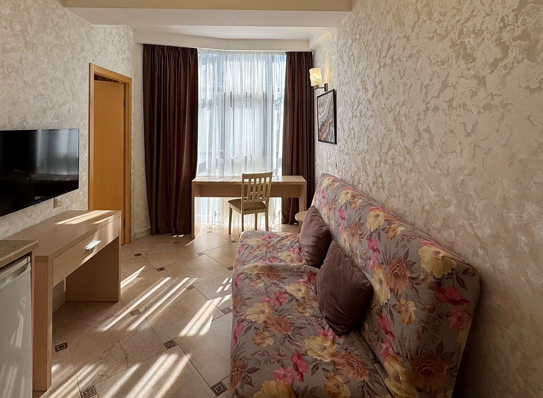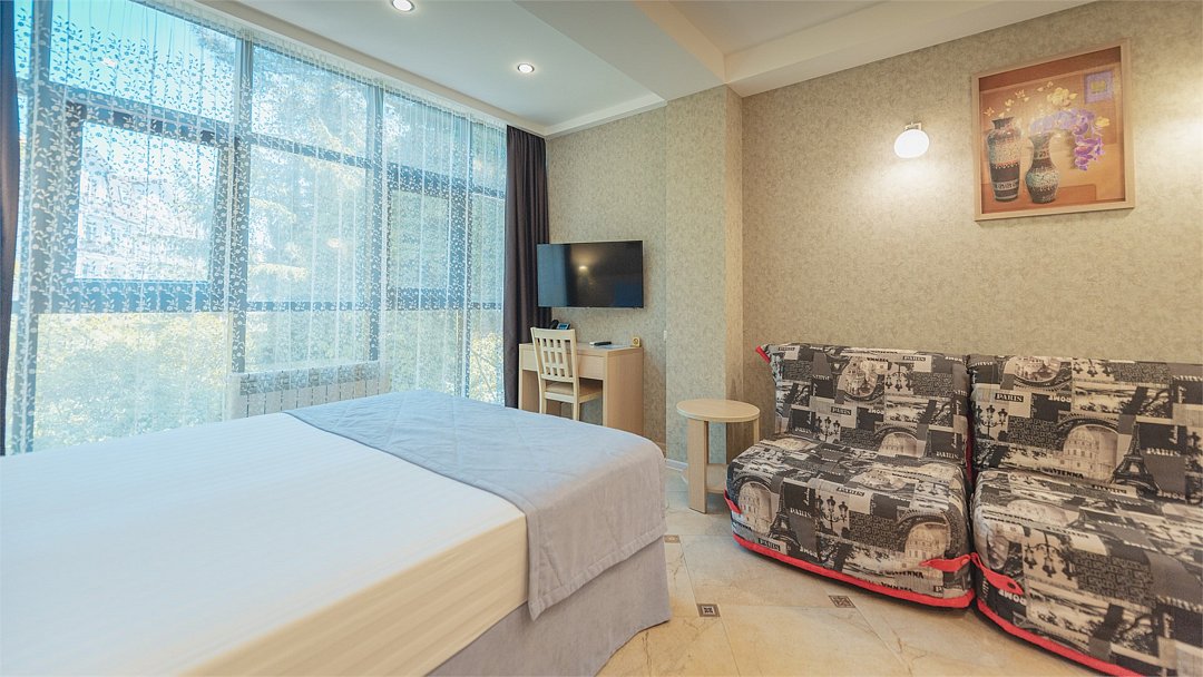 Wi-Fi, кондиционер, фен, электронные замки, плита для приготовления пищи, микроволновая печь, санузел, банные полотенца, пляжные полотенца, тапочки, гигиенические средства, косметические средства, полутораспальная кровать, шкаф для одежды, вешалки, журнальный столик, зеркало, сейф, унитаз, раковина, душ, кулер на этаже, стул, туалетные средства, туалет, цифровое тв, раскладной диван, внутренний телефон, мини-холодильник, шкаф-купе, телевизор со Smart TV, без питомцевВ гостиничном номере