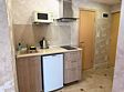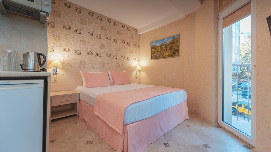 Однокомнатный номер с двухместной кроватью, с небольшим балконом, кухня с микроволновой печью, холодильником, электрическими конфорками, вытяжкой воздуха, раковиной, так же в номере установлена сплит система , телевизор, сан.узел с душем и феном, две прикроватные тумбы, шкаф, настенная вешалка с зеркалом, стол под телевизор, коктейльный столик, стул, стационарный телефон, сейф, стандартный комплект посуды.Услуги и удобства