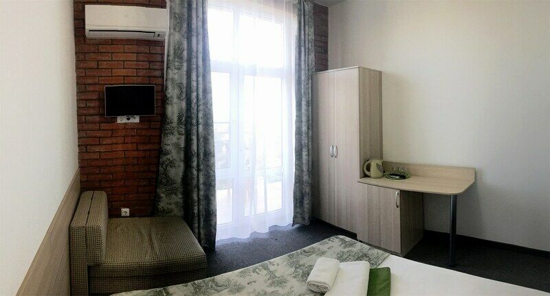 Просторный номер с витражными окнами, может разместить двух гостей на основных местах и одного-на дополнительном. Большой балкон с прекрасным видом на море располагает к спокойному отдыху в кругу семьи.Услуги и удобства