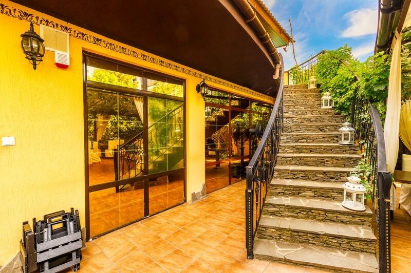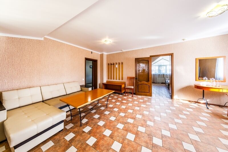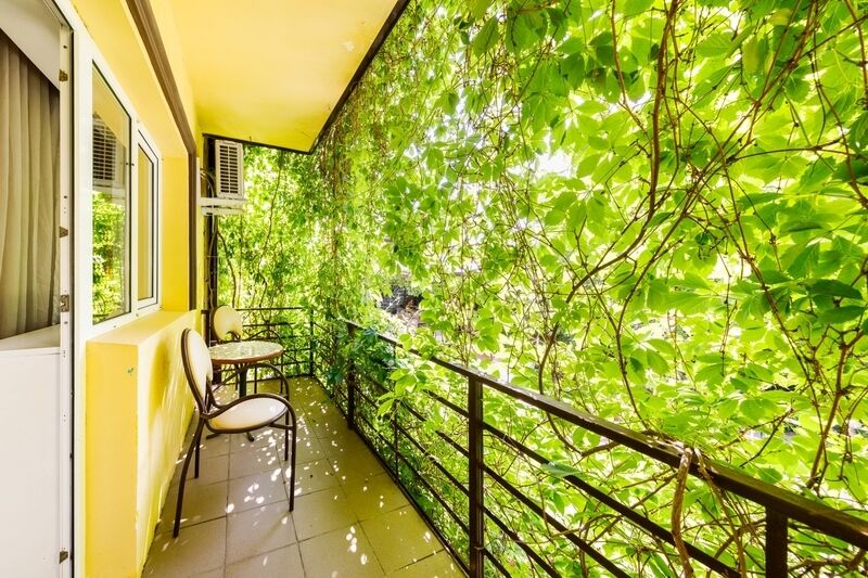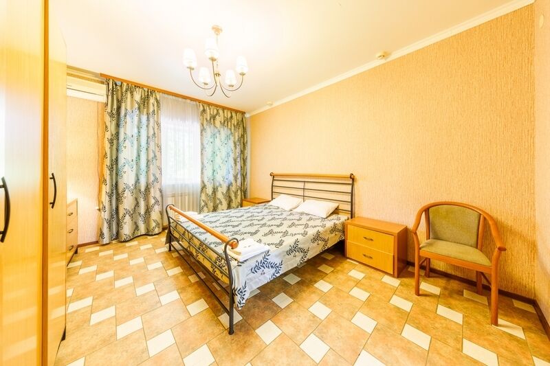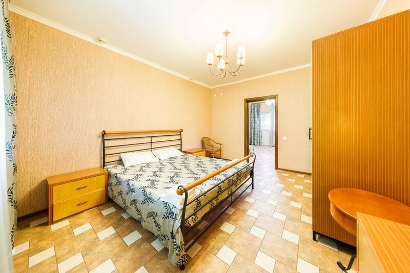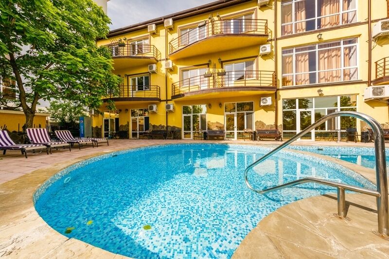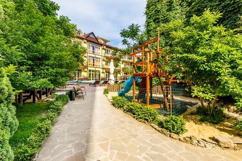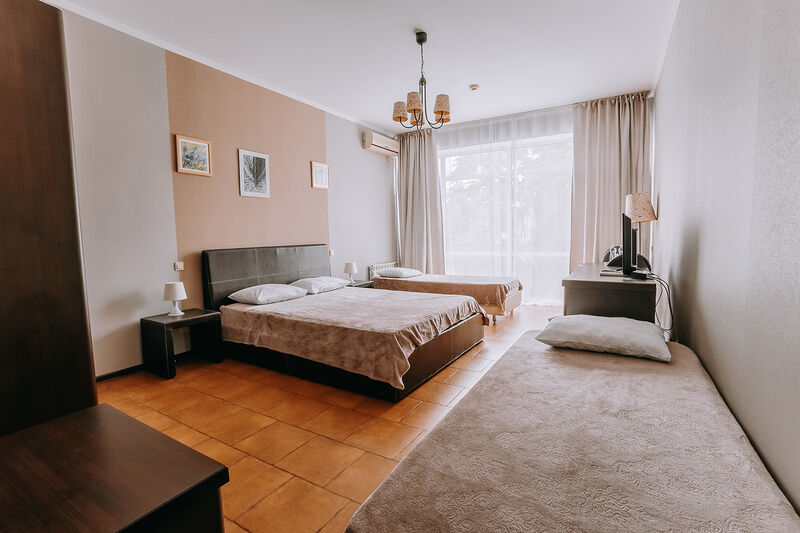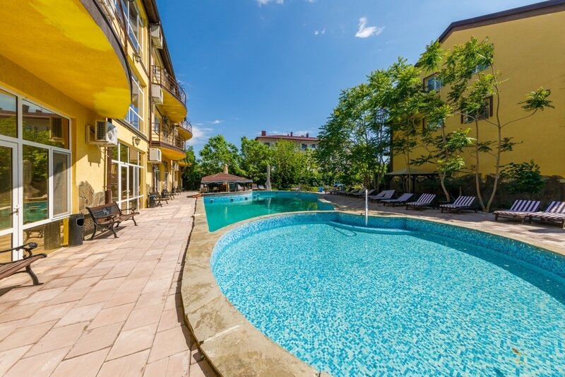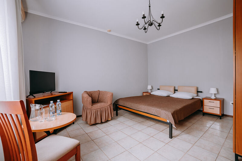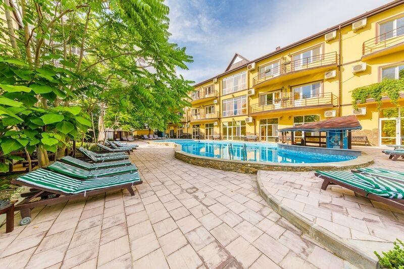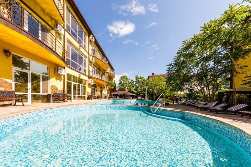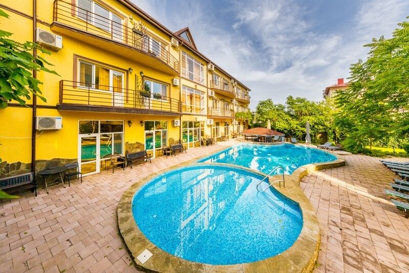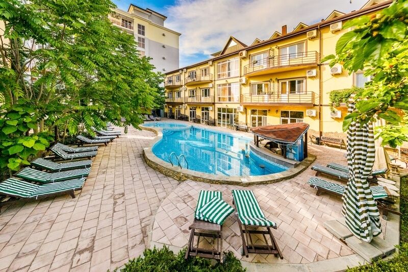 Трехэтажный корпус гостевого дома занимает благоустроенную закрытую территорию в 500 метрах от моря. В распоряжении гостей однокомнатные и двухкомнатные номера со светлыми приятными интерьерами. Во всех номерах есть собственный санузел с душем, кондиционер, плазменный телевизор, беспроводной интернет, в некоторых комнатах предусмотрены балконы.
