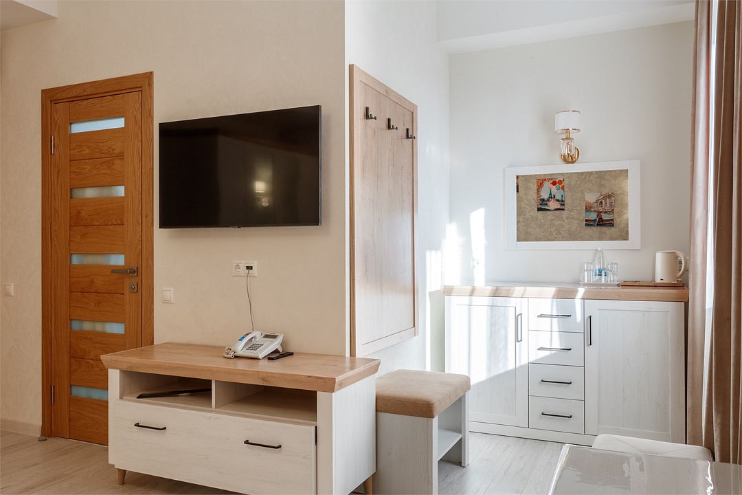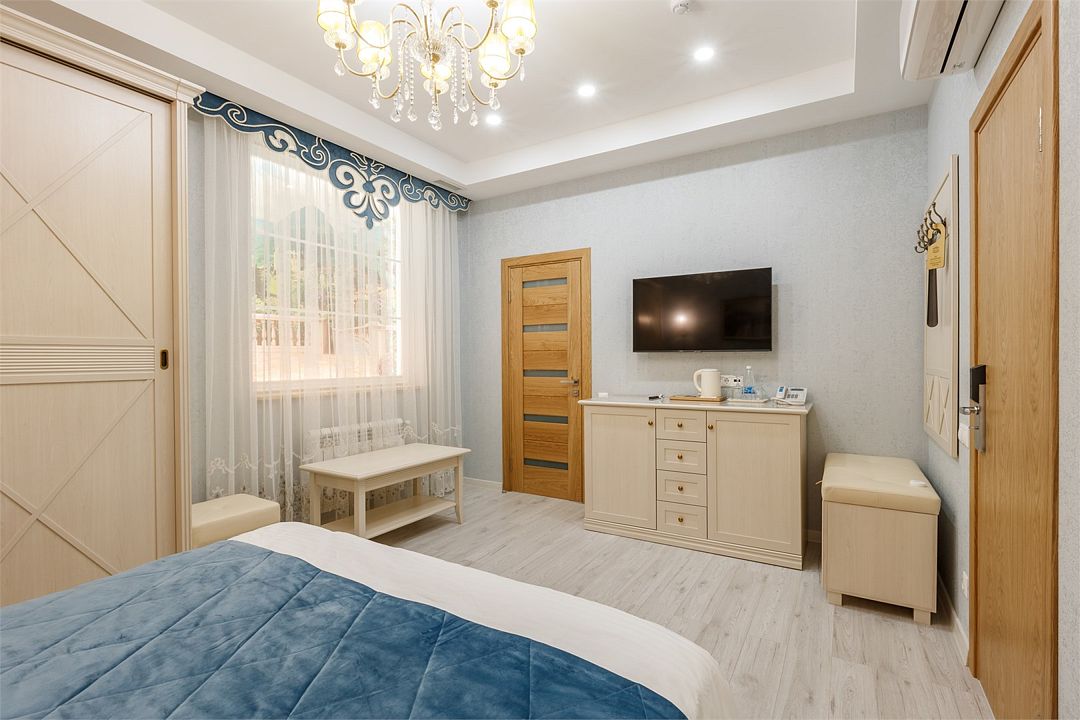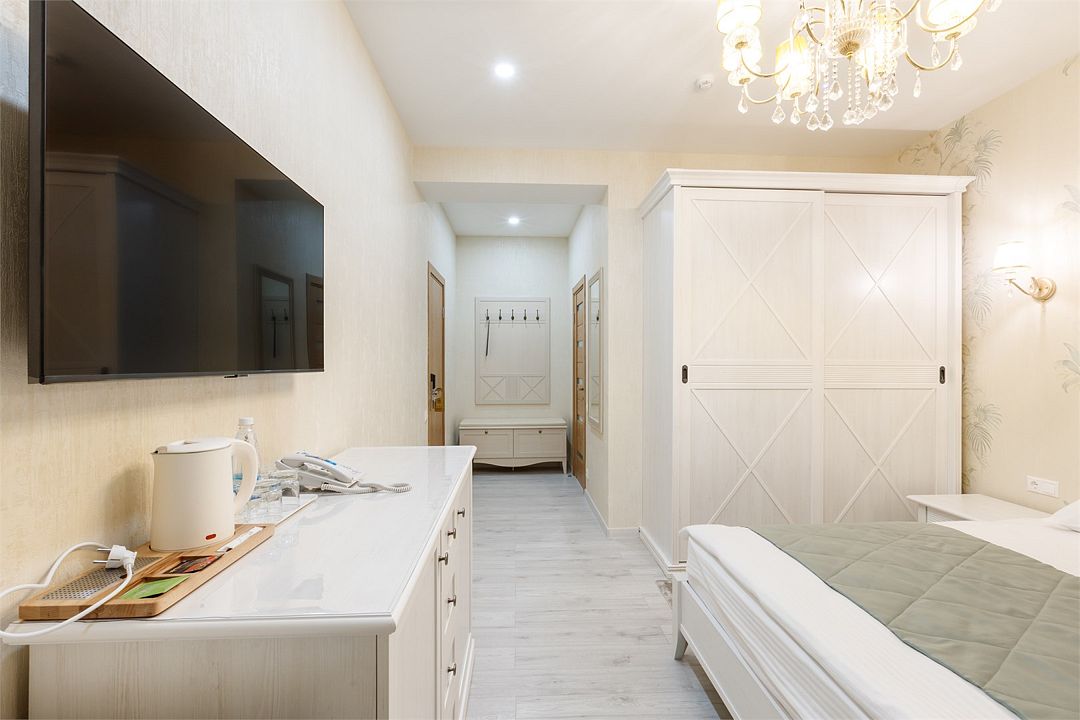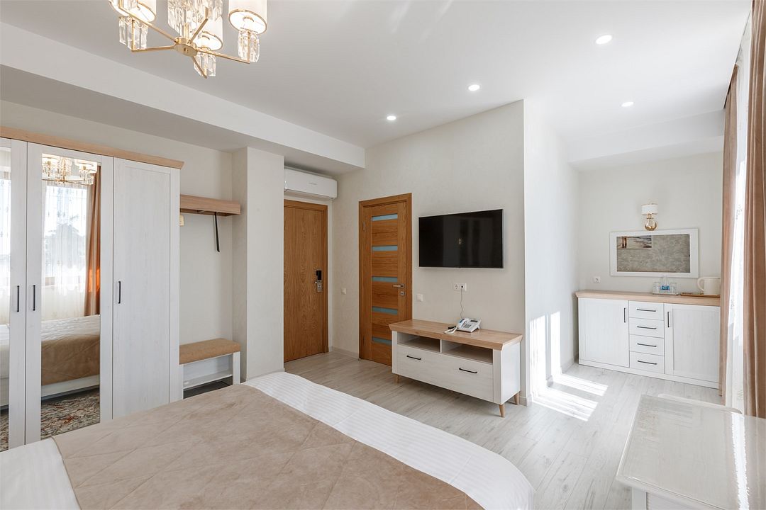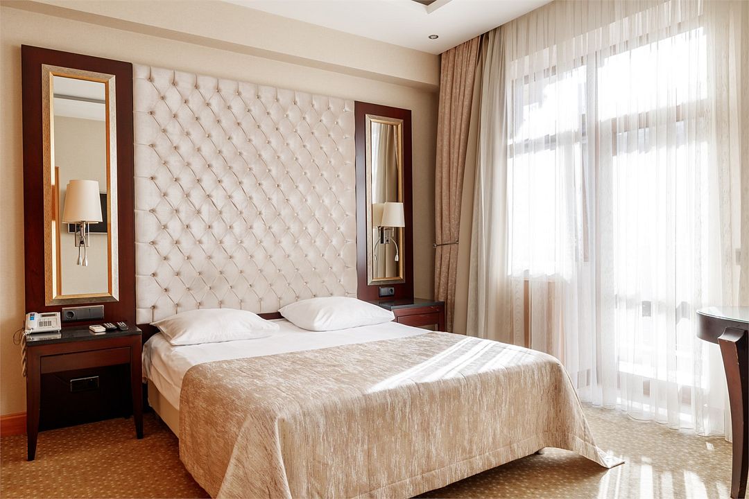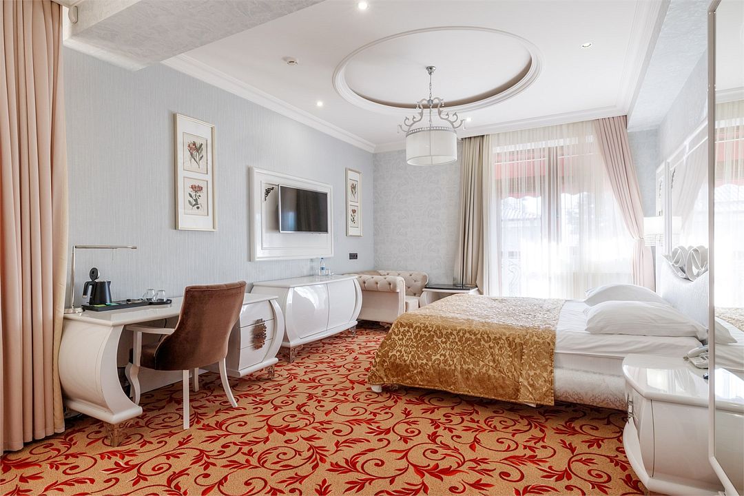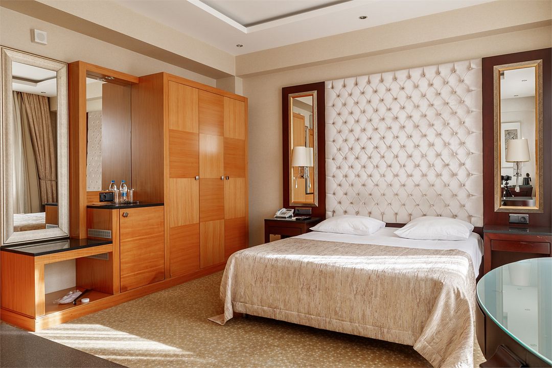 Однокомнатный просторный номер площадью 30 кв.м.: двуспальная кровать, шкаф/гардероб, кресло/стул, стол, сейф, балкон, набор посуды, мини - холодильник, кондиционер, телефонная связь, телевизор с плоским экраном, бесплатный Wi-Fi. Собственная ванная комната: душ, фен, полотенца, косметические принадлежности, тапочки, халат.Услуги и удобства
