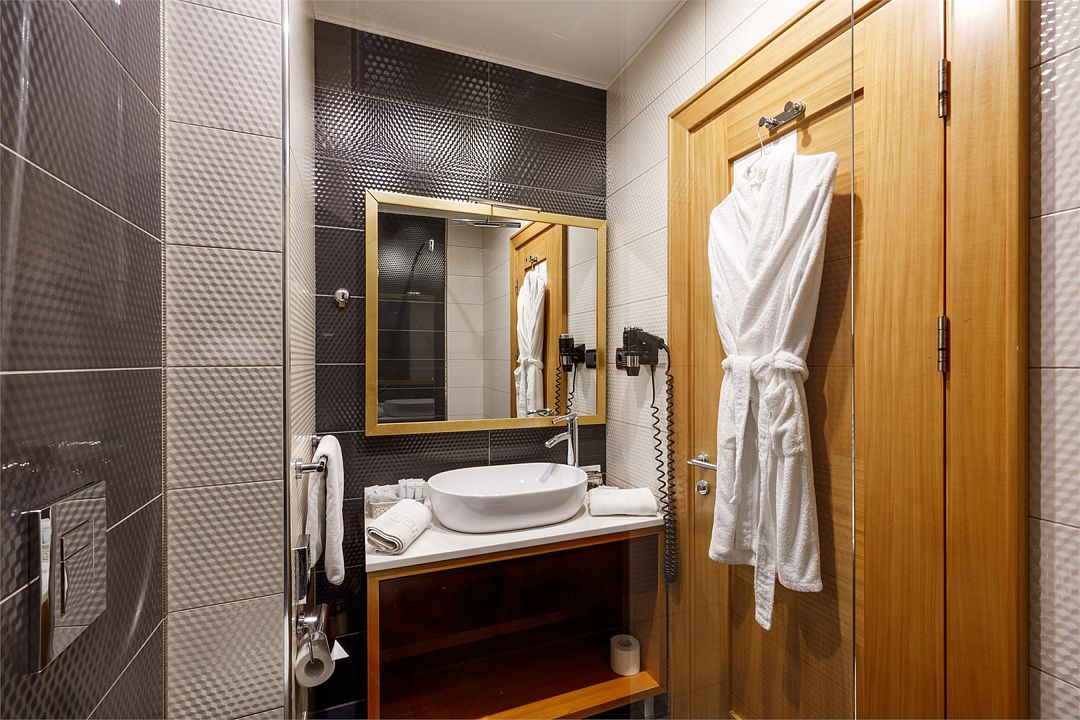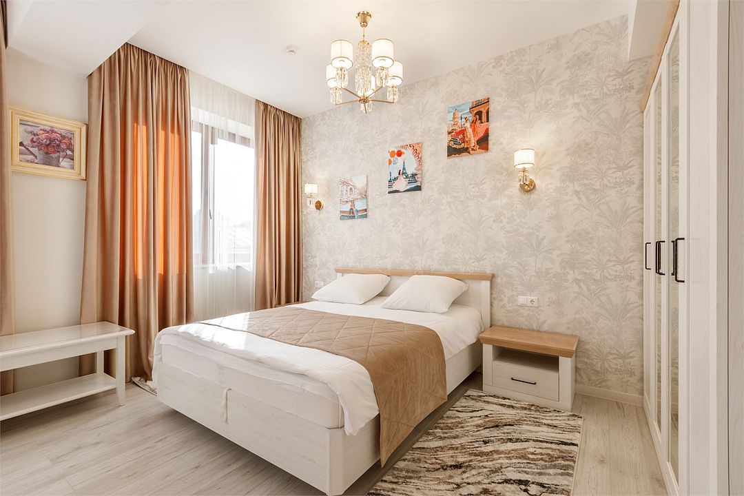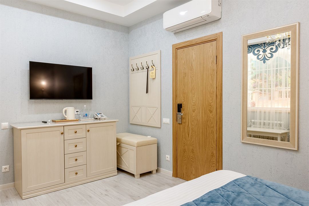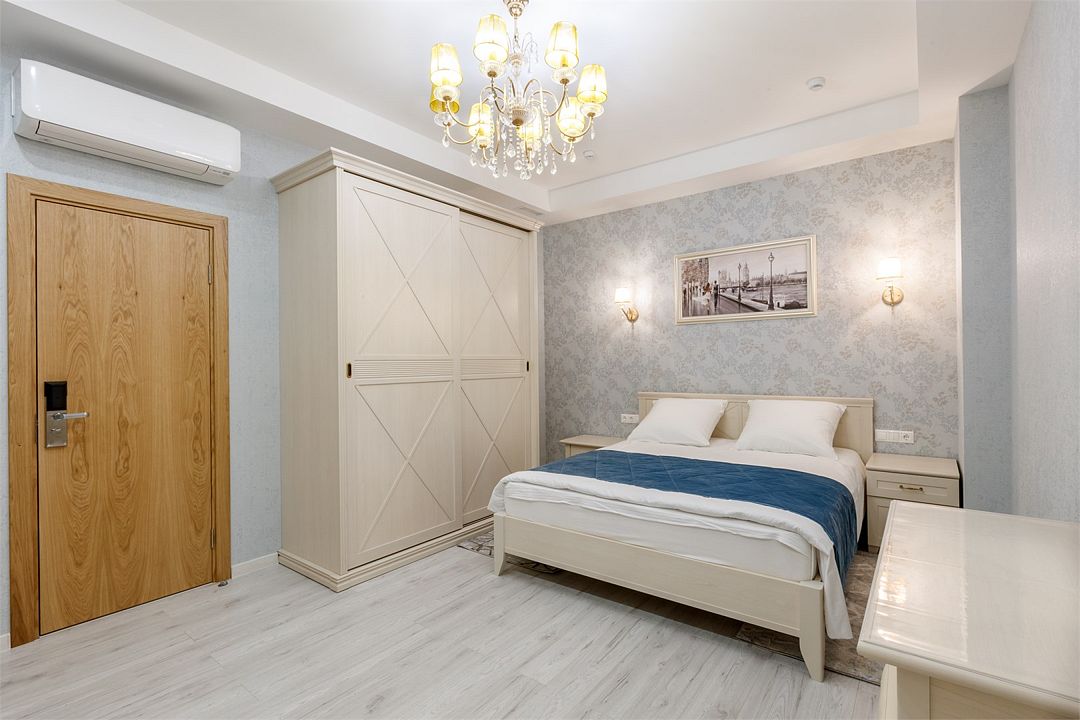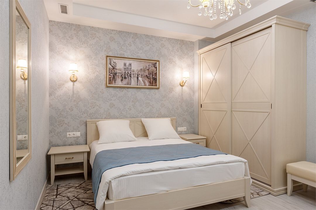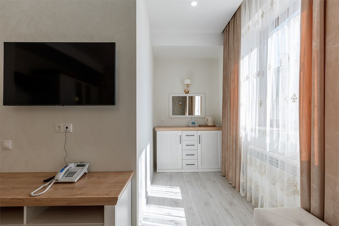 Однокомнатный просторный номер площадью 30 кв.м.: двуспальная кровать, шкаф/гардероб, кресло/стул, стол, сейф, балкон, набор посуды, мини - холодильник, кондиционер, телефонная связь, телевизор с плоским экраном, бесплатный Wi-Fi. Собственная ванная комната: душ, фен, полотенца, косметические принадлежности, тапочки, халат.Услуги и удобства