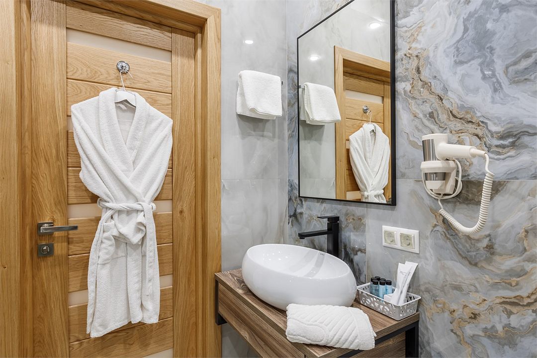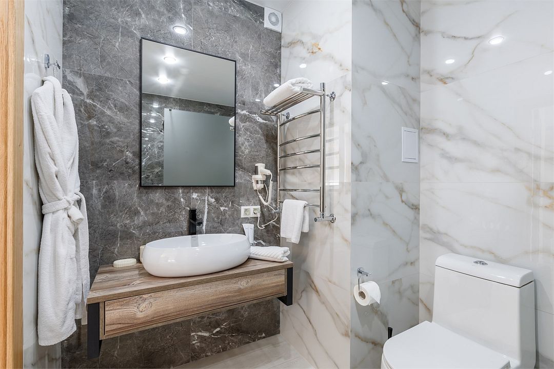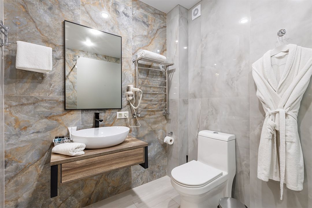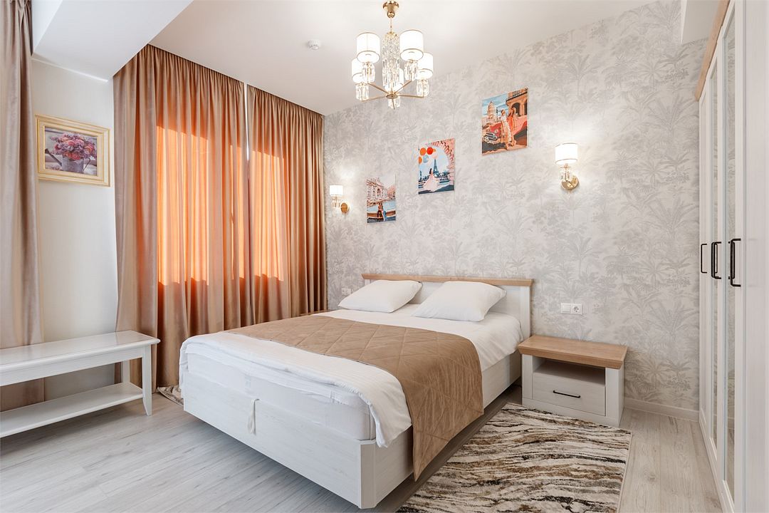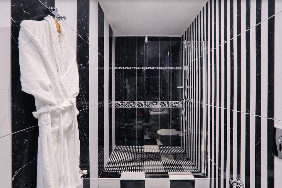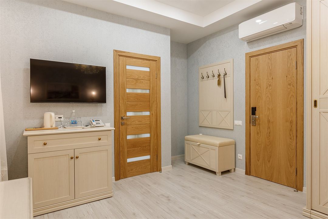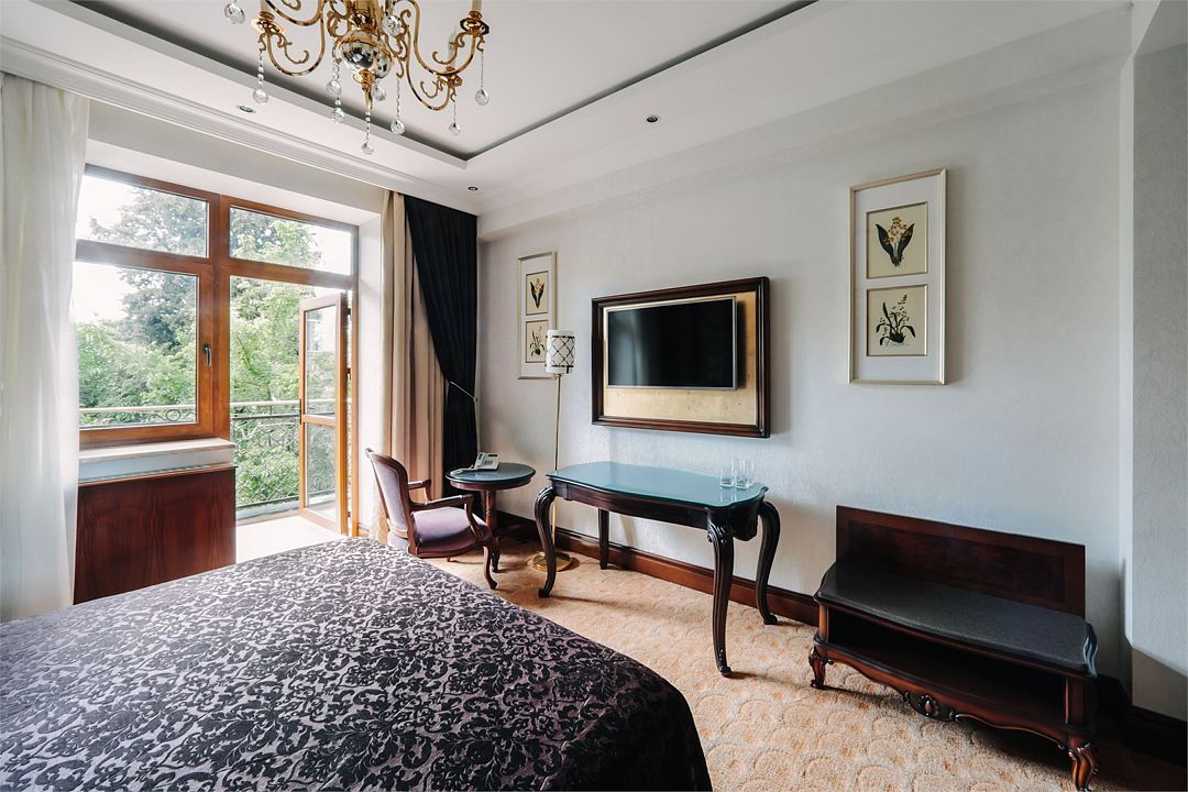 Однокомнатный просторный номер площадью 30 кв.м.: двуспальная кровать, шкаф/гардероб, кресло/стул, стол, сейф, балкон, набор посуды, мини - холодильник, кондиционер, телефонная связь, телевизор с плоским экраном, бесплатный Wi-Fi. Собственная ванная комната: душ, фен, полотенца, косметические принадлежности, тапочки, халат.Услуги и удобства